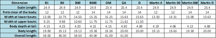 My steel string guitar size specifications, with Martin sizes
