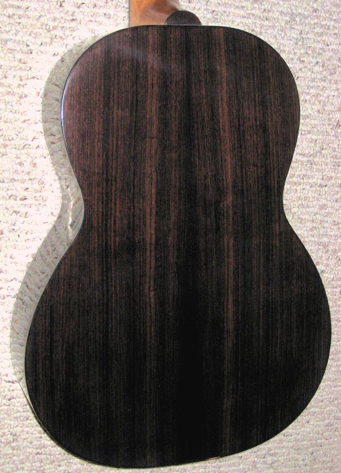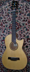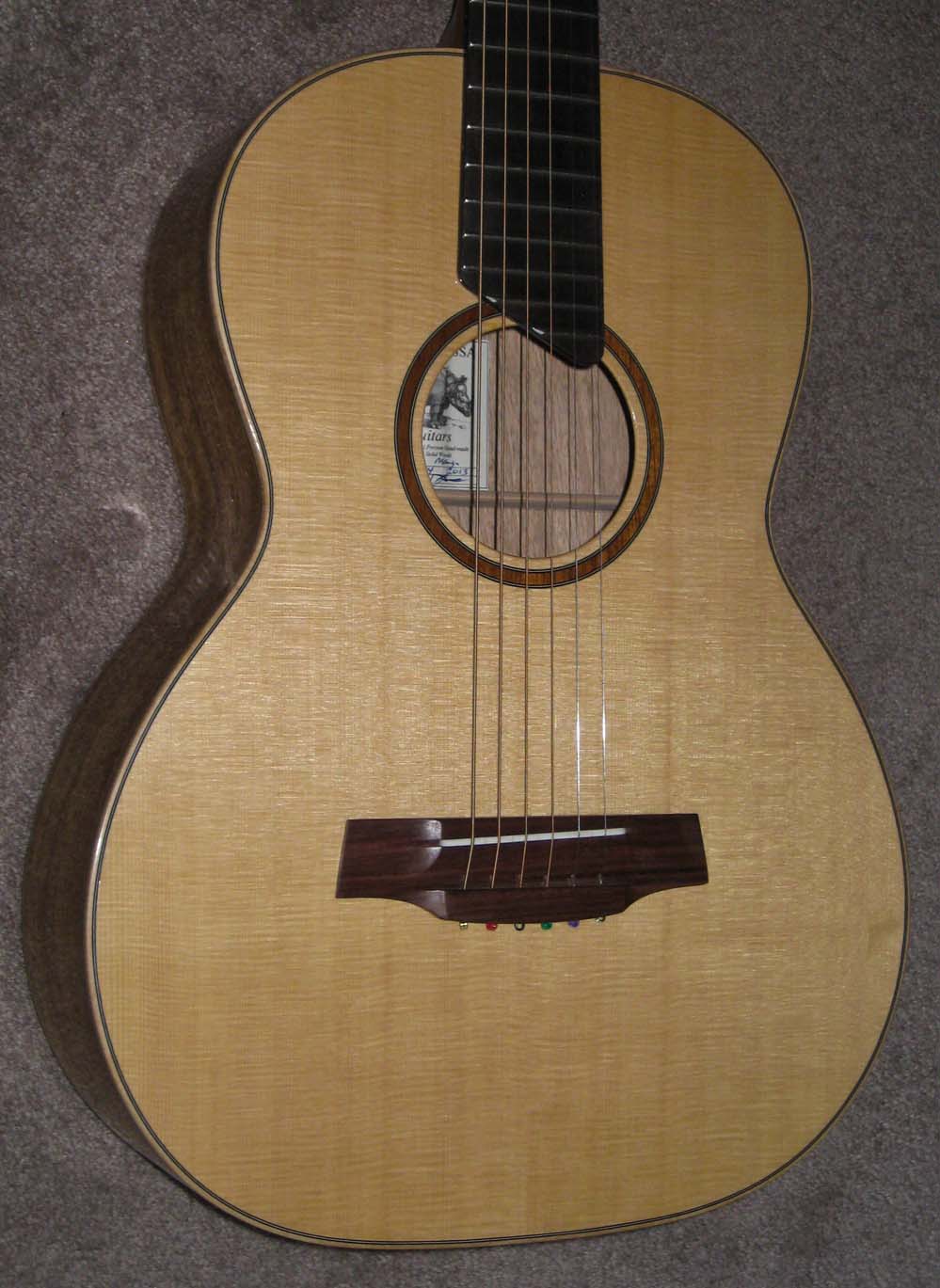 Jim, When I asked you to build me a modified Size 1 and for you to make the wood selection based on my criteria, I had good hopes it would come out fine based on the two previous OO size guitars you built for me. I have had the new Size 1 for about seven months and can give this report: Playability: the neck shape, scale length, and body size/depth make this very ergonomic for someone like me who needs a smaller and shallower guitar. I can play as long as I want without discomfort. Looks: the wood combo, rosette, binding and body shape make this guitar very pleasing to the eye. People remark on how nice it looks. How does it sound? It seems to have no limit as far as headroom, it just gets louder, yet it handles very soft fingerstyle well. The European spruce top and madrona back and sides combine to give this guitar a really strong voice. With single notes and two note chords, you hear a wonderful array of pleasing overtones, yet they don't interfere with clarity when playing full chord or fingerstyle. As you remarked, it does have the punch of rosewood with the clarity of maple. It has more power than anyone could expect from its small size. It holds its own when played with OM size guitars. It is balanced across the strings. This has become my favorite guitar for its tone. The grain on the madronna is very very fine and interesting up close. Thanks for building this custom model for me. I love it! |