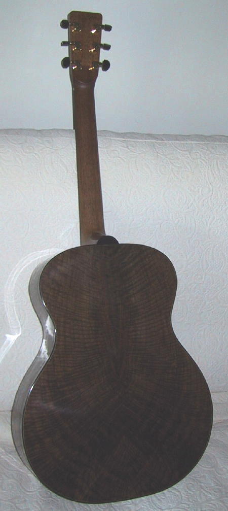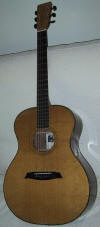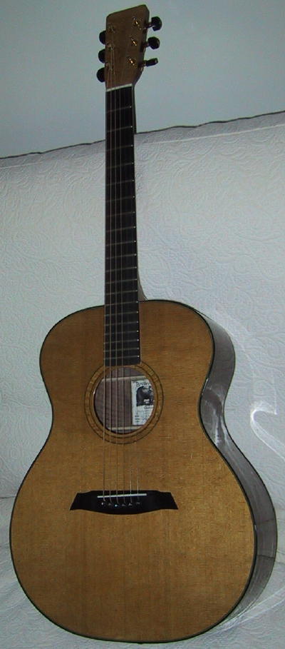 Comments from this happy B00 (double) owner: Jim, I have been playing acoustic for over 40 years and have owned over 20 guitars including vintage Gibsons, a top of the line Takamine, and many other makes: Ovation, Epiphone, Yamaha, Seagull and so forth .I've played a few Martins as well. The 00 cedar/rosewood is a phenomenal instrument. It responds to a very light touch, yet projects like anything when asked to. Now, I play fingerstyle, and the wood combination along with the wide fingerboard and the 12 fret configuration is a fingerstyle equation for fun. Wish I had spent what I put into my spruce topped parlor to get a spruce topped 00 from you...maybe another year, if I can sell my parlor. My commendations on the best sounding guitar I have played. You do have a talent for your work and I am happy to let anyone play the 00 to hear for themselves. This guitar is balanced across the strings and up and down the fingerboard. It has the best intonation of any guitar I've played. I guess the compenstated bone saddle has something to do with it. Honestly, the guitar is louder and sounds better with light guage strings than my custom shop all solid wood Takamine model ( EF417s) does with medium strings, and the Takamine is a great sounding guitar. Hats off! RH in Statesboro, Georgia" November 2008 |