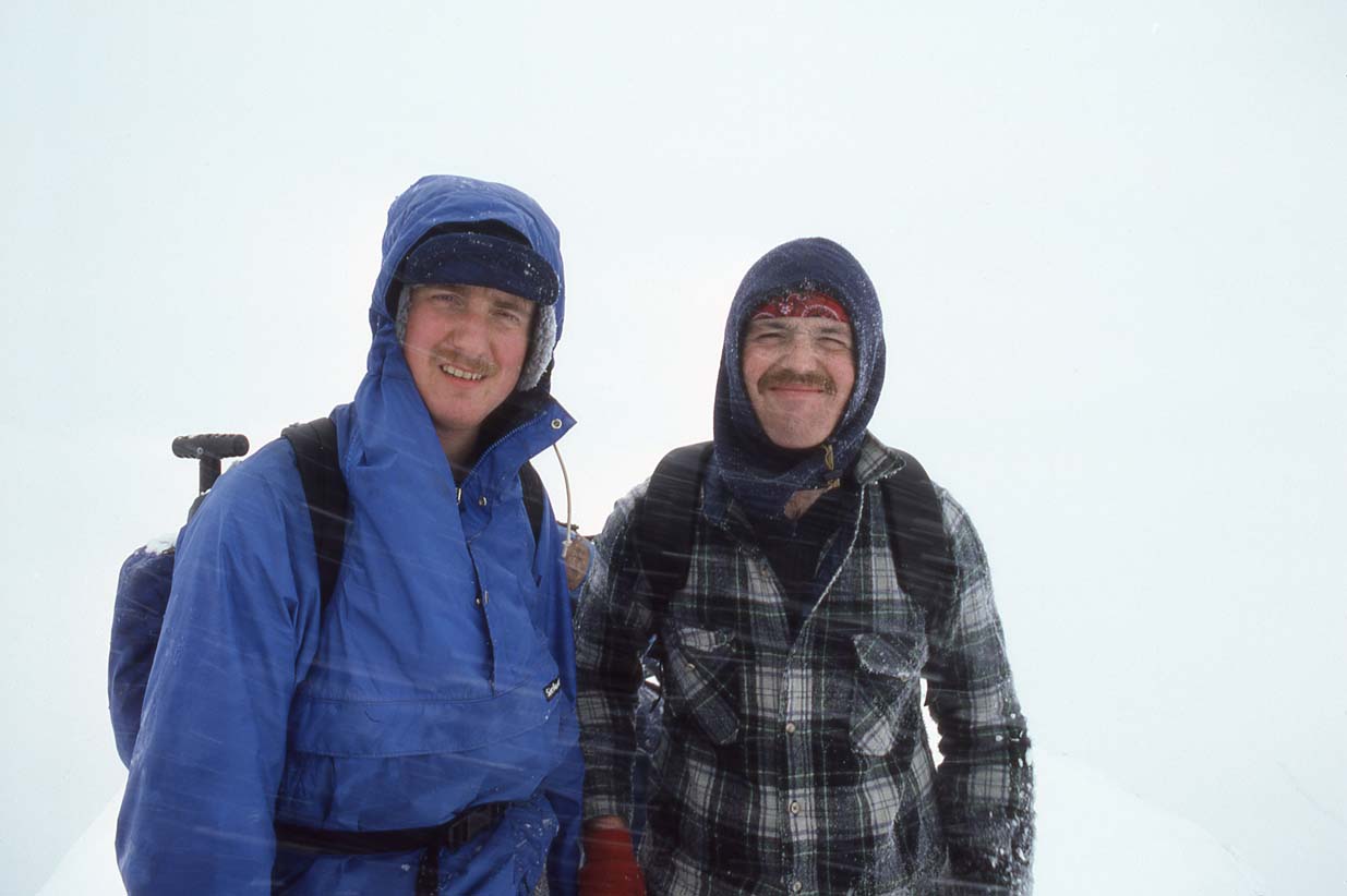 Mt. Baring, early 1986, on the summit in blowing snow, me and Paul Michelson |