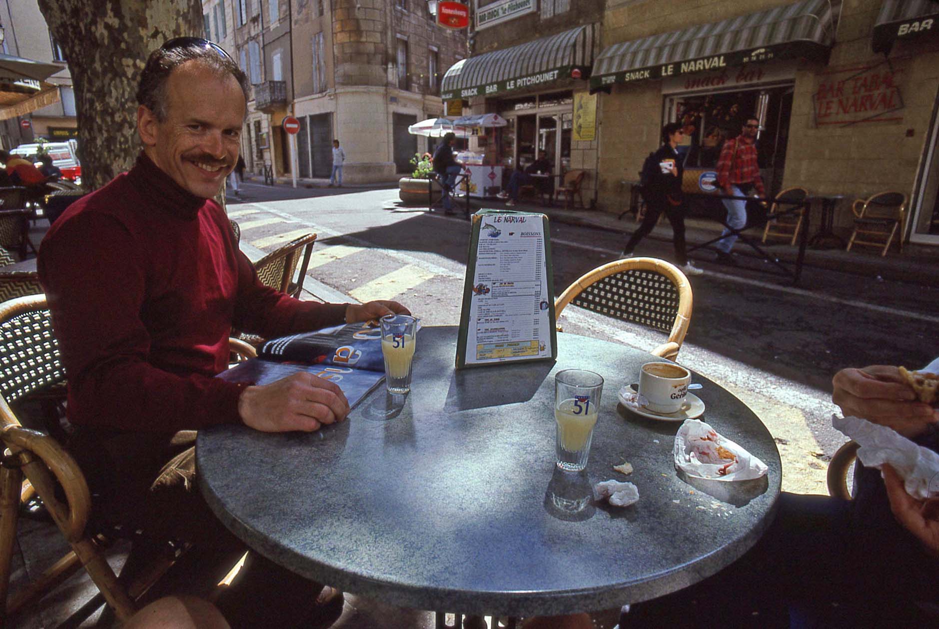 Bonnieux, Jeanne with a huge bowl of cafe au lait in the cavernous pattiserie in an ancient olive oil mill. |