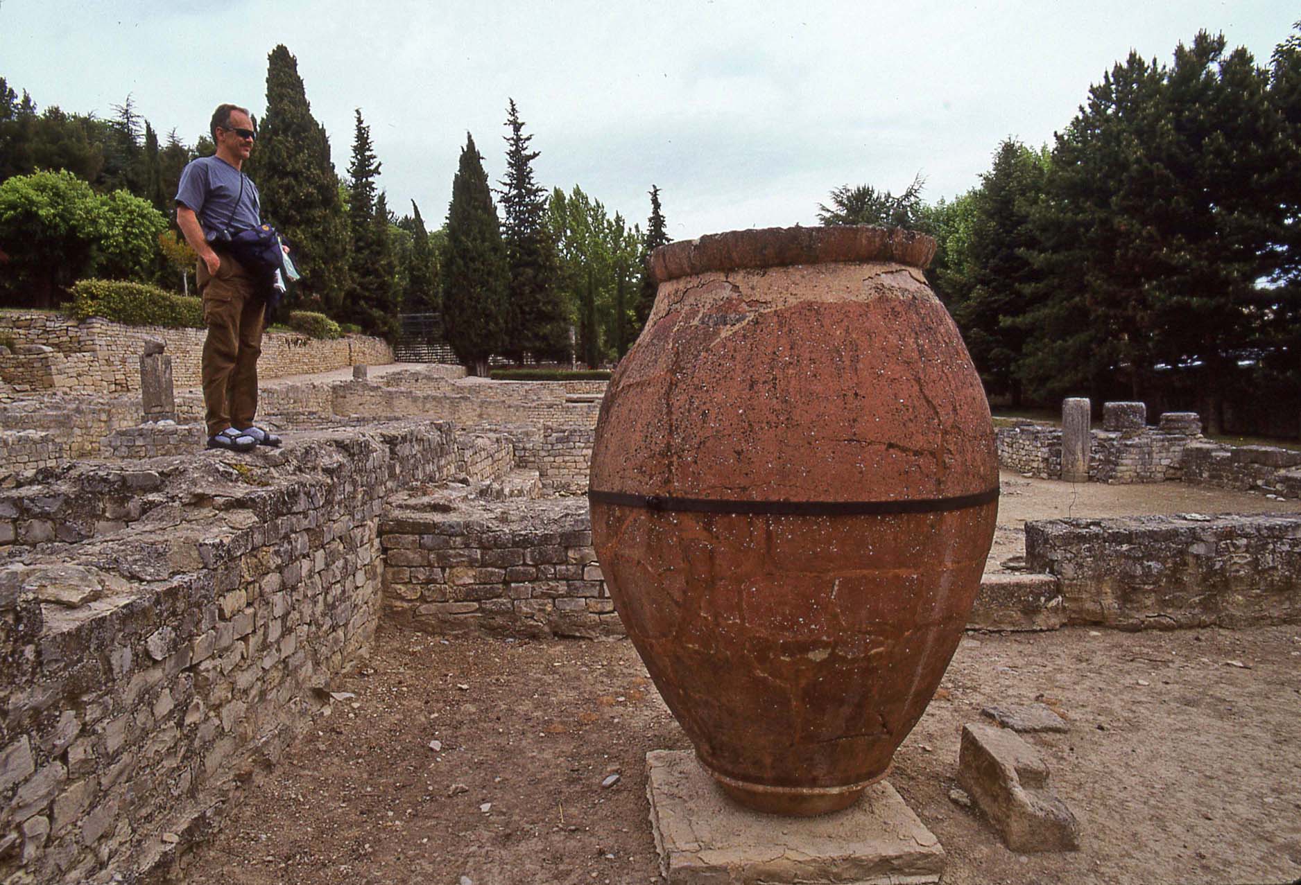 Vaison la Romaine, Steve Mason next to a "Dolum" a huge wine vat, normally buried (I'd like to see the potter's wheel and the kiln!) |