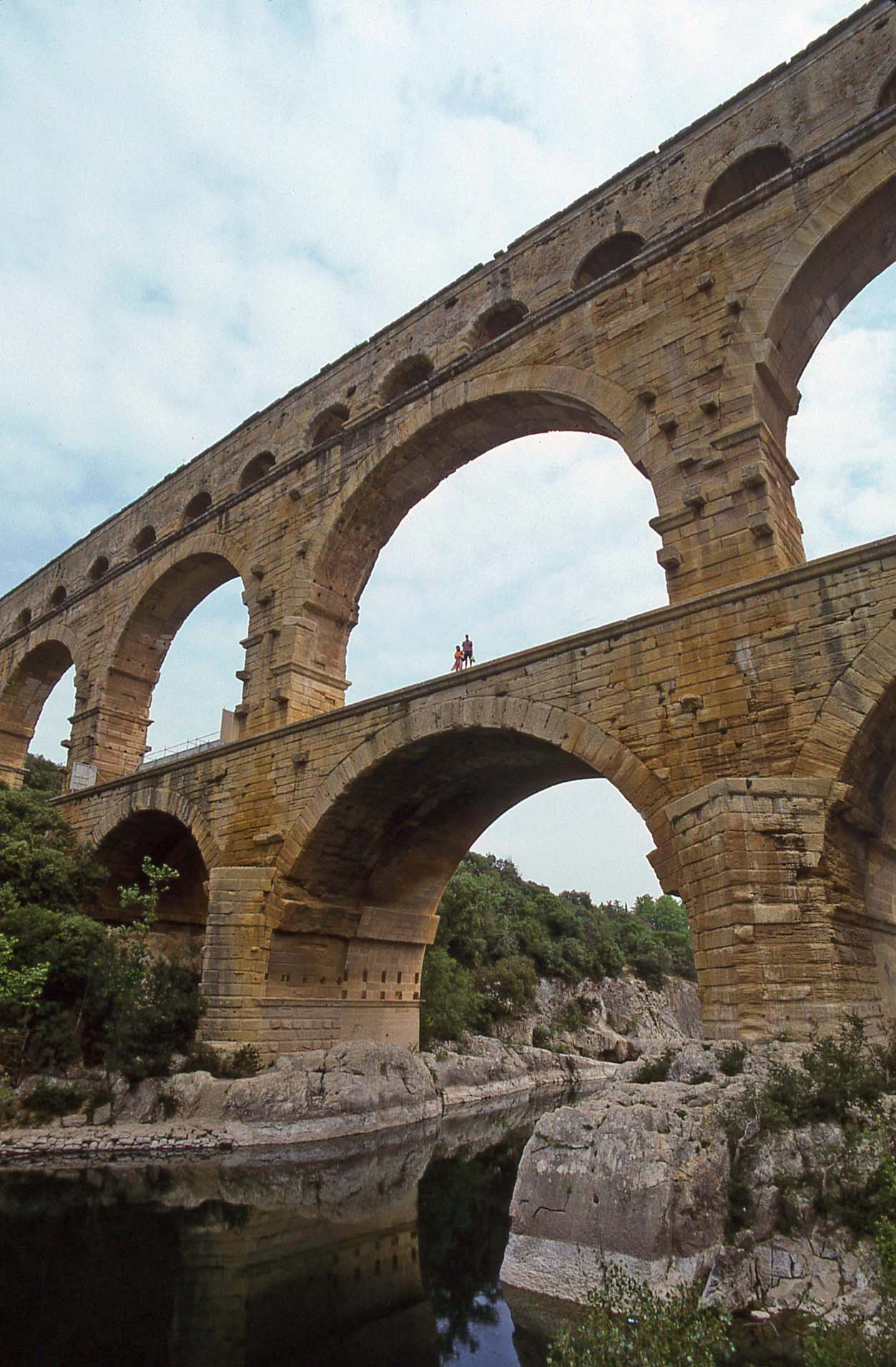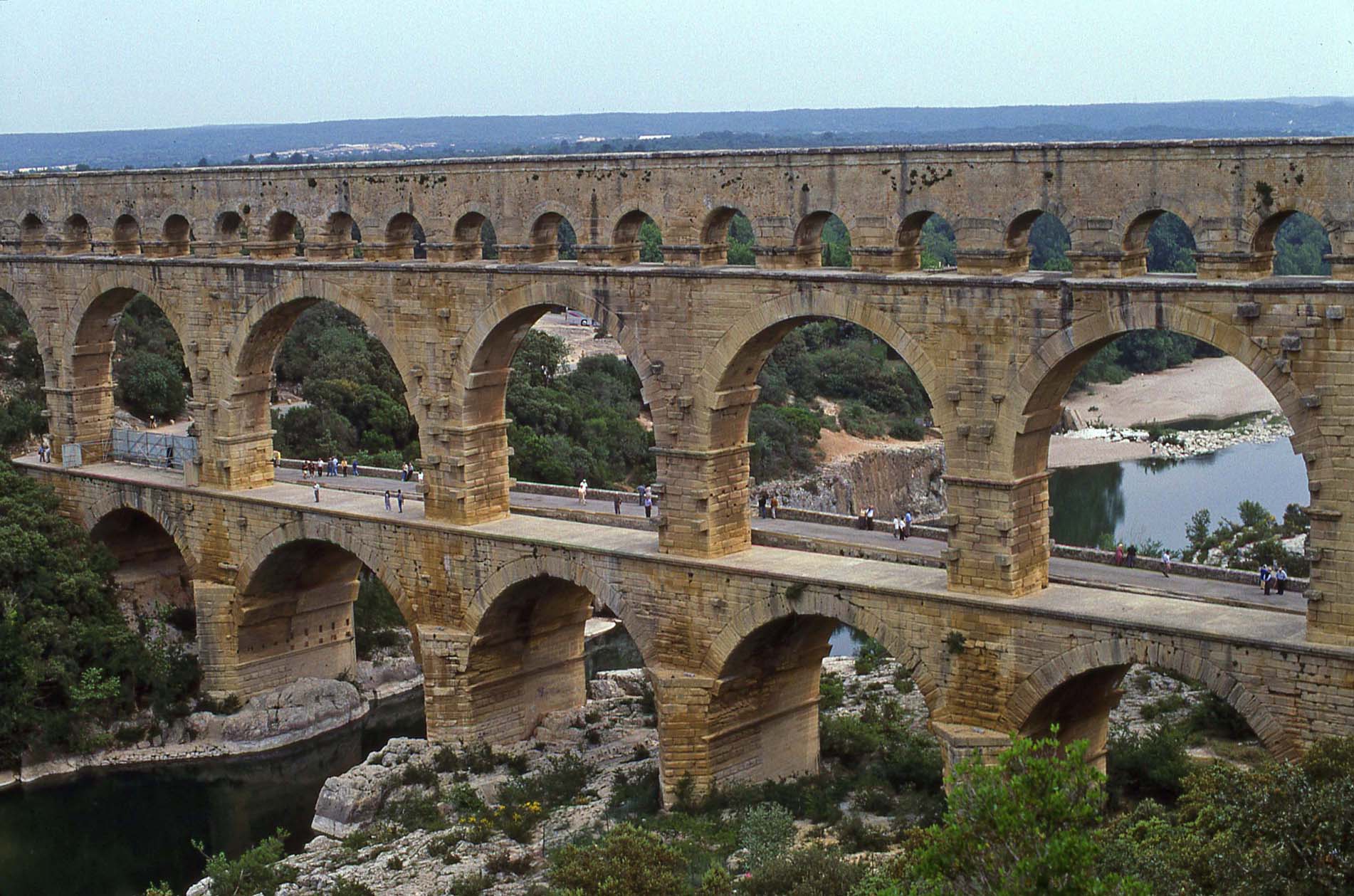 Pont du Gard, part of a Roman Aqueduct (part of a nearly 50 km (31 mi) aqueduct that brought water from the Fontaines d'Eure springs near Uzès to the Castellum in the Roman city of Nemausus (Arles). |