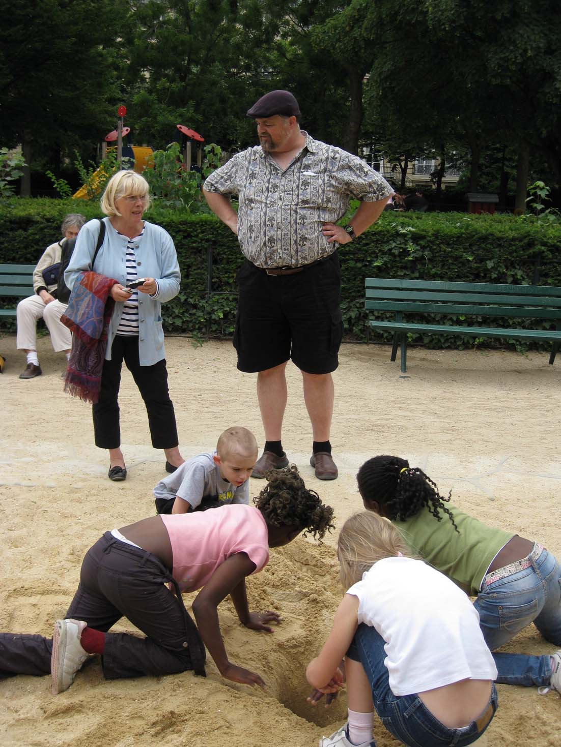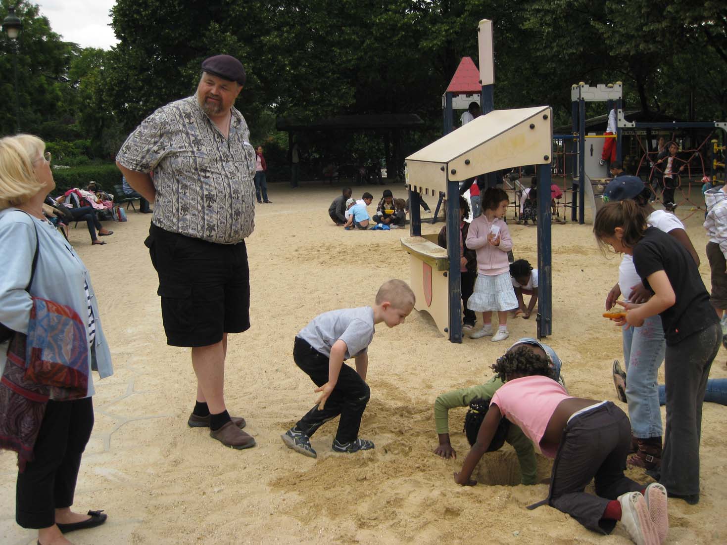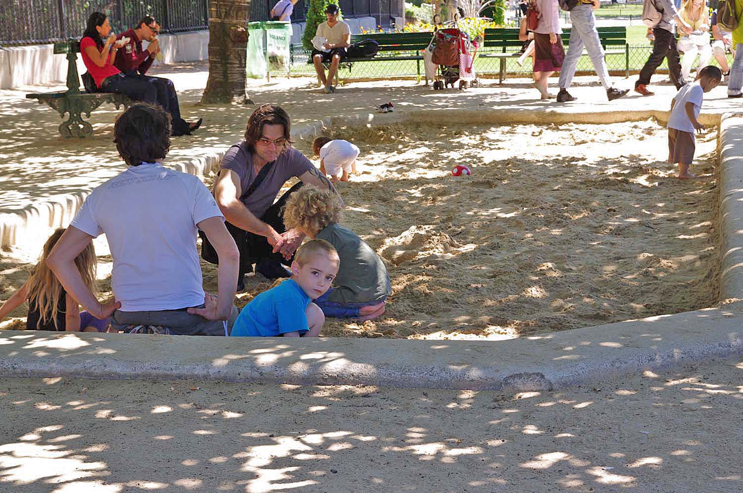 | We found a shady, dog-free sandbox next to Notre Dame for lunch and a place for Jamie to play | Sandbox |