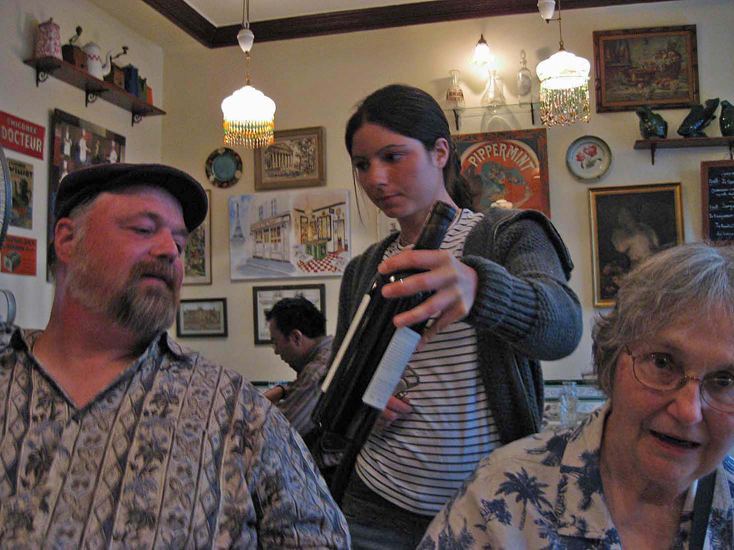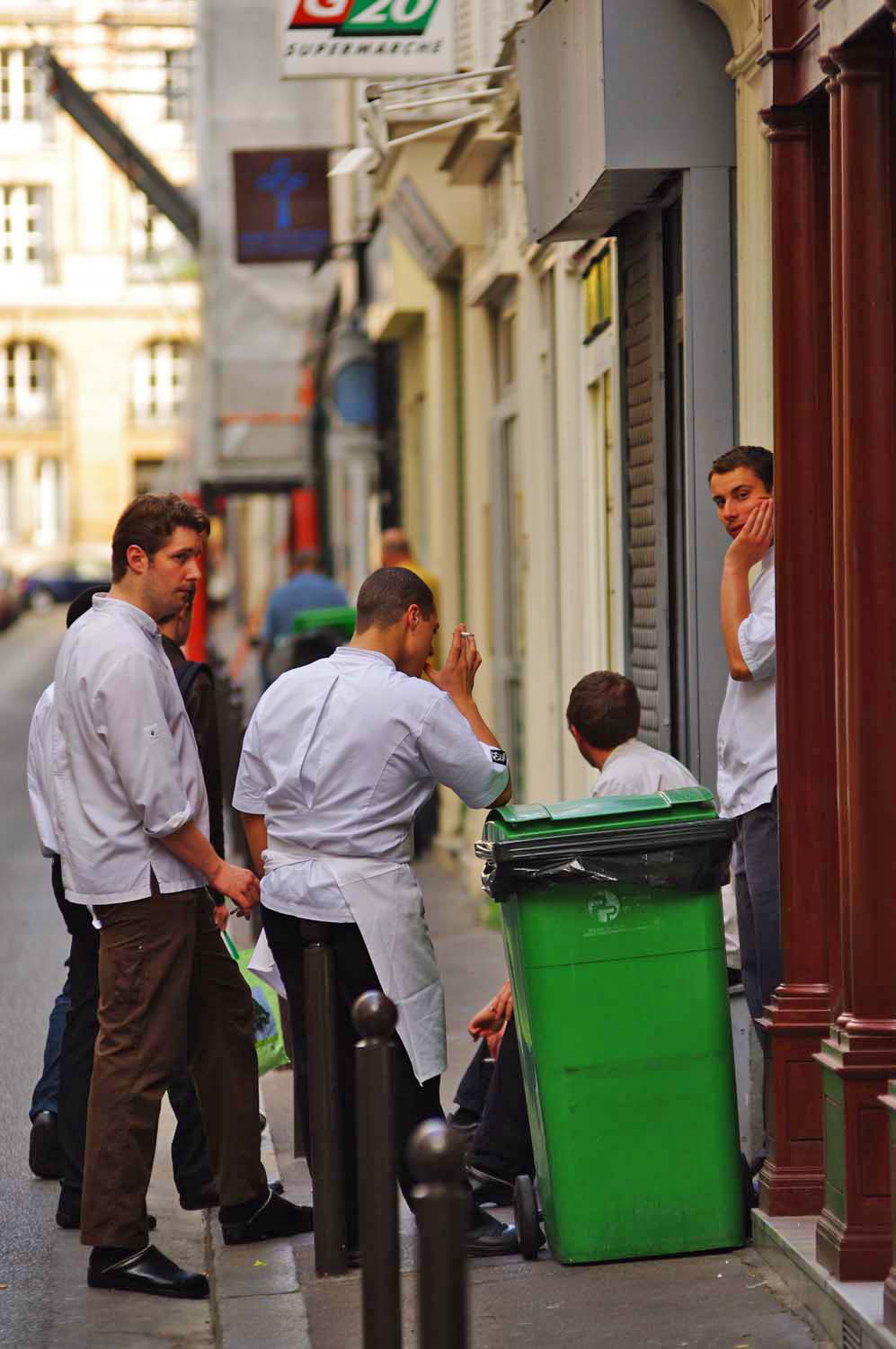 Waiters, hanging out before the dinner rush begins. |