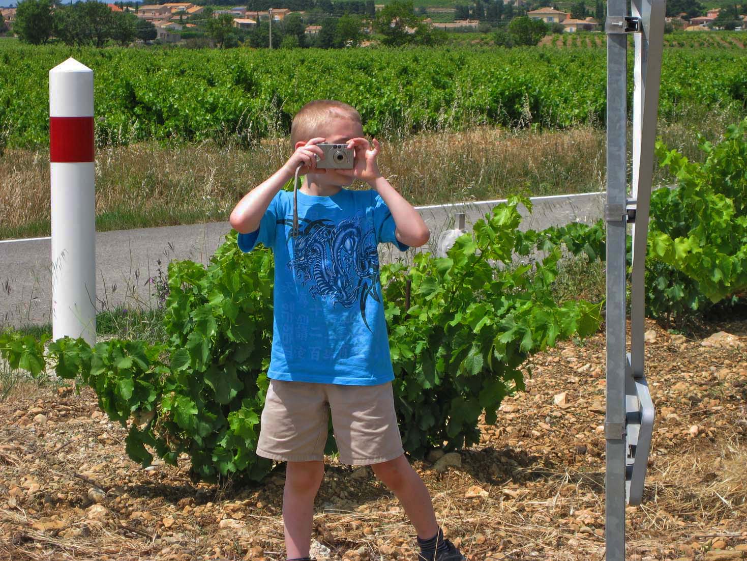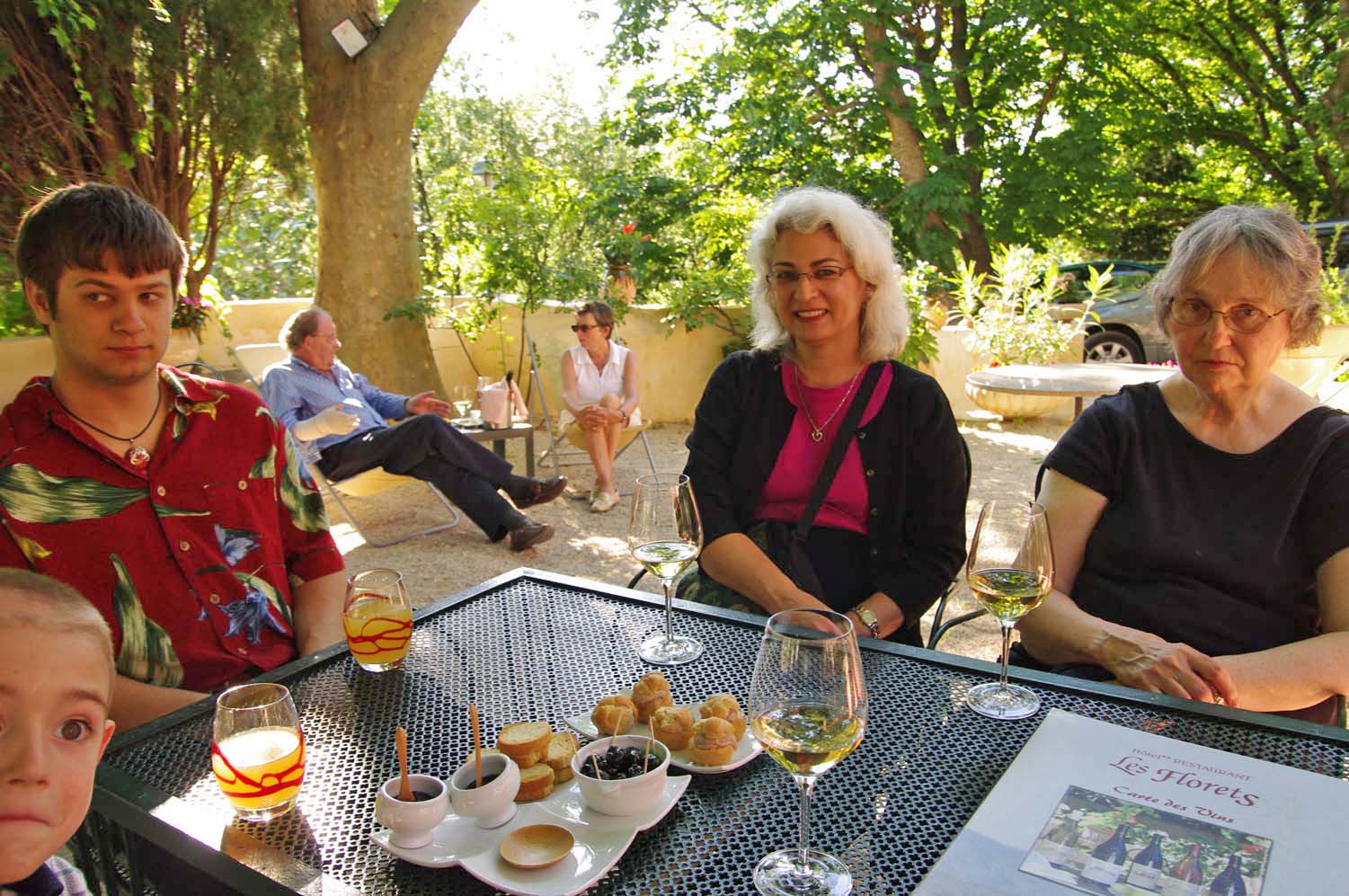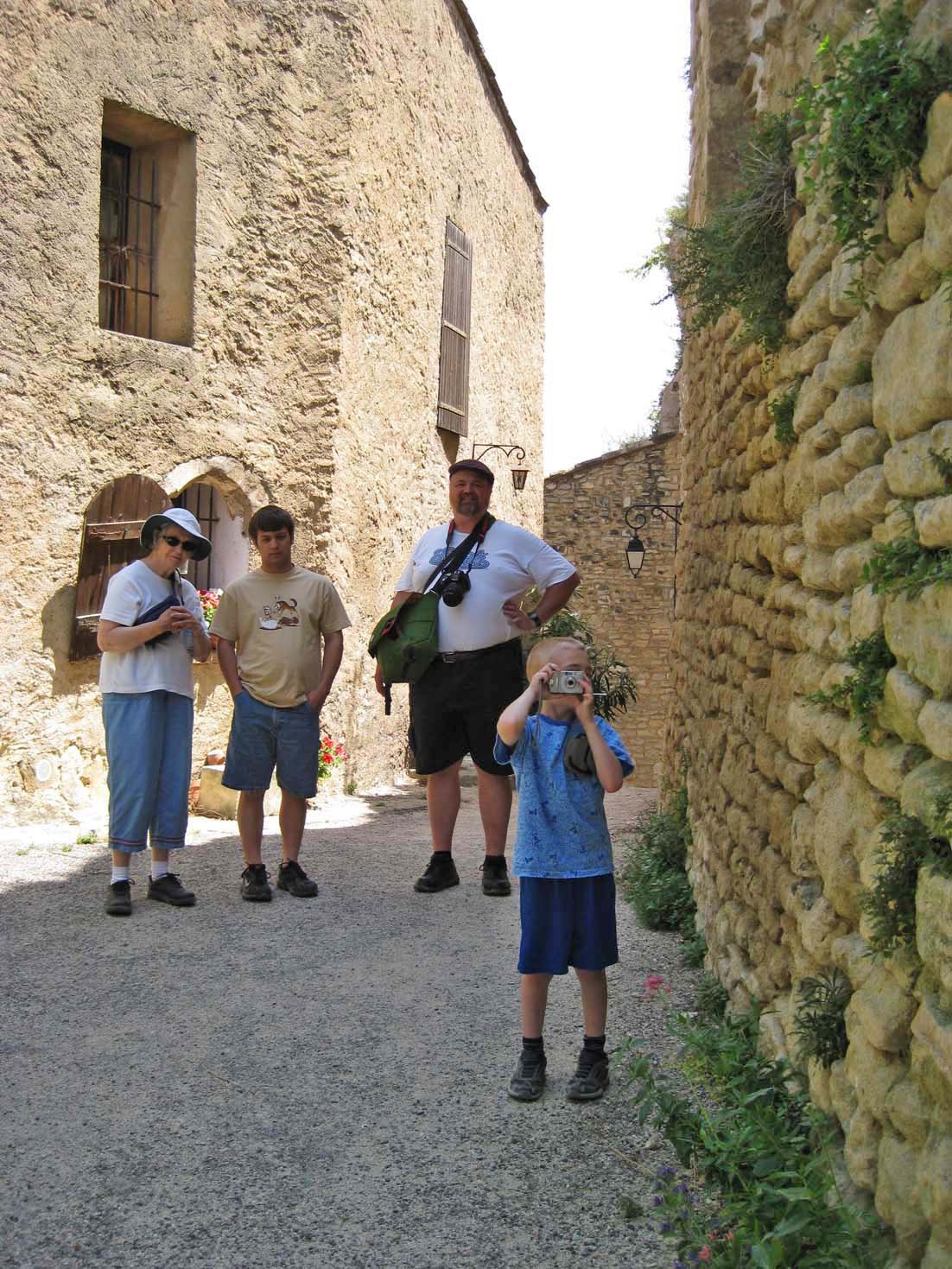 | At the Gites at Sarrians | At the Gites at Sarrians | At the Gites at Sarrians, and a tunnel of plane trees at nearby Aubignon | Jamie with his mechanical bird | Our first stop: The hillside village of Seguret, on Sunday |