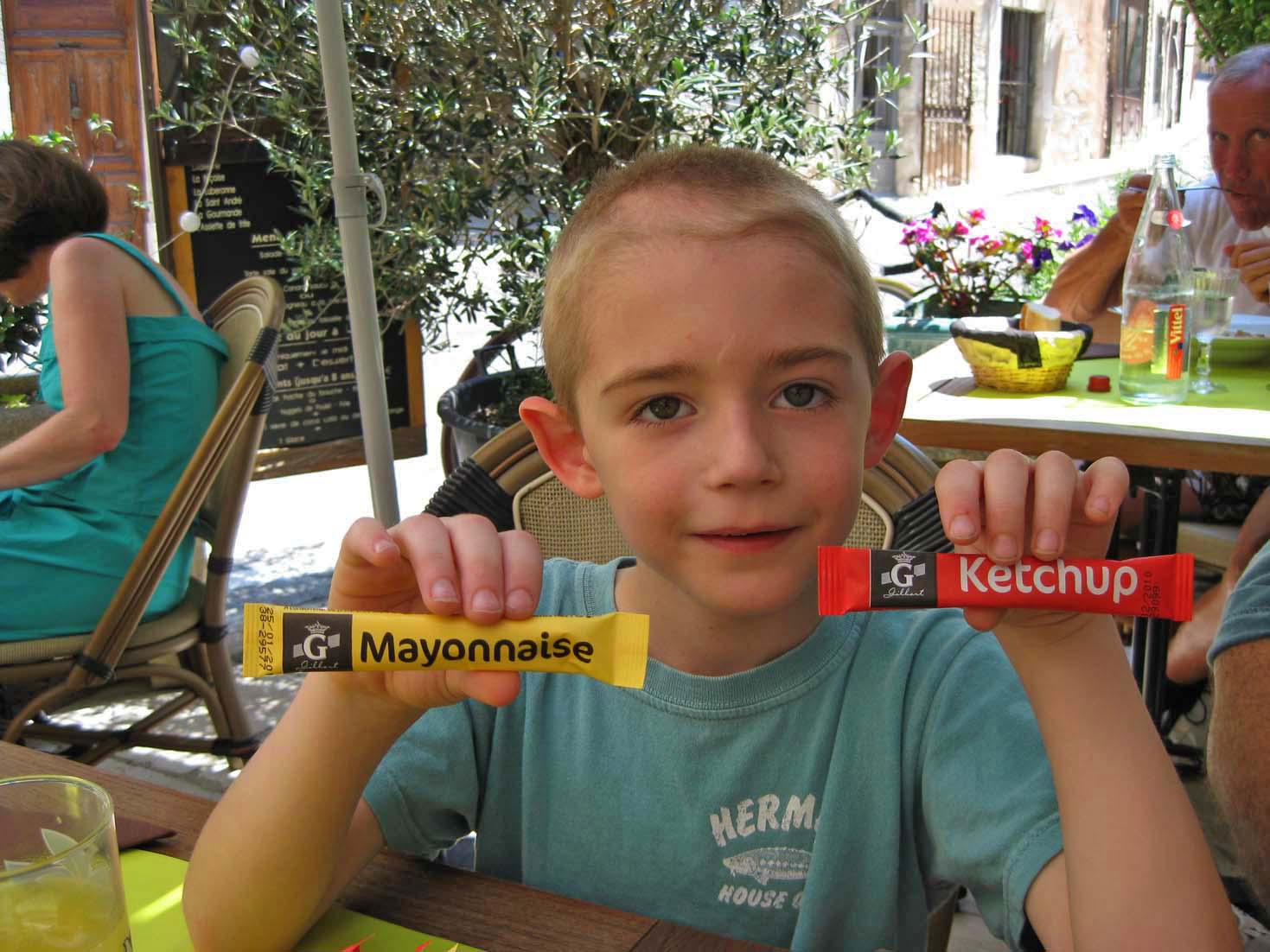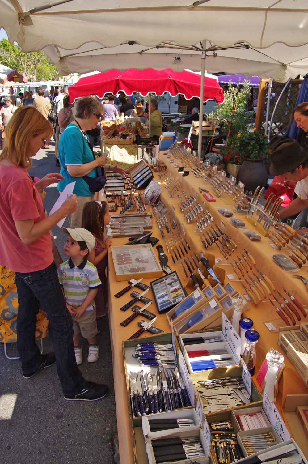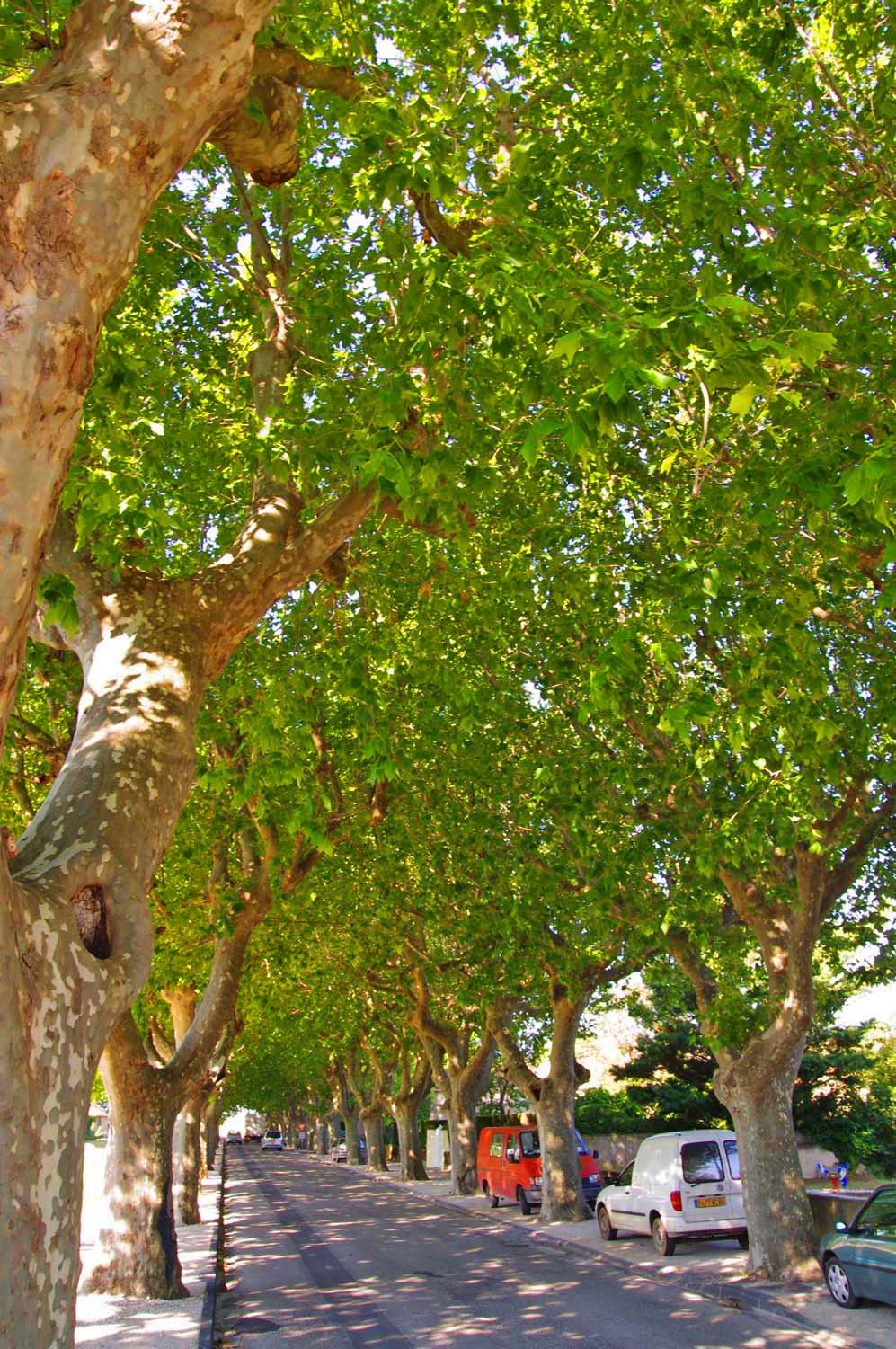 | At the Gites at Sarrians | At the Gites at Sarrians | At the Gites at Sarrians, and a tunnel of plane trees at nearby Aubignon | Jamie with his mechanical bird | Our first stop: The hillside village of Seguret, on Sunday |