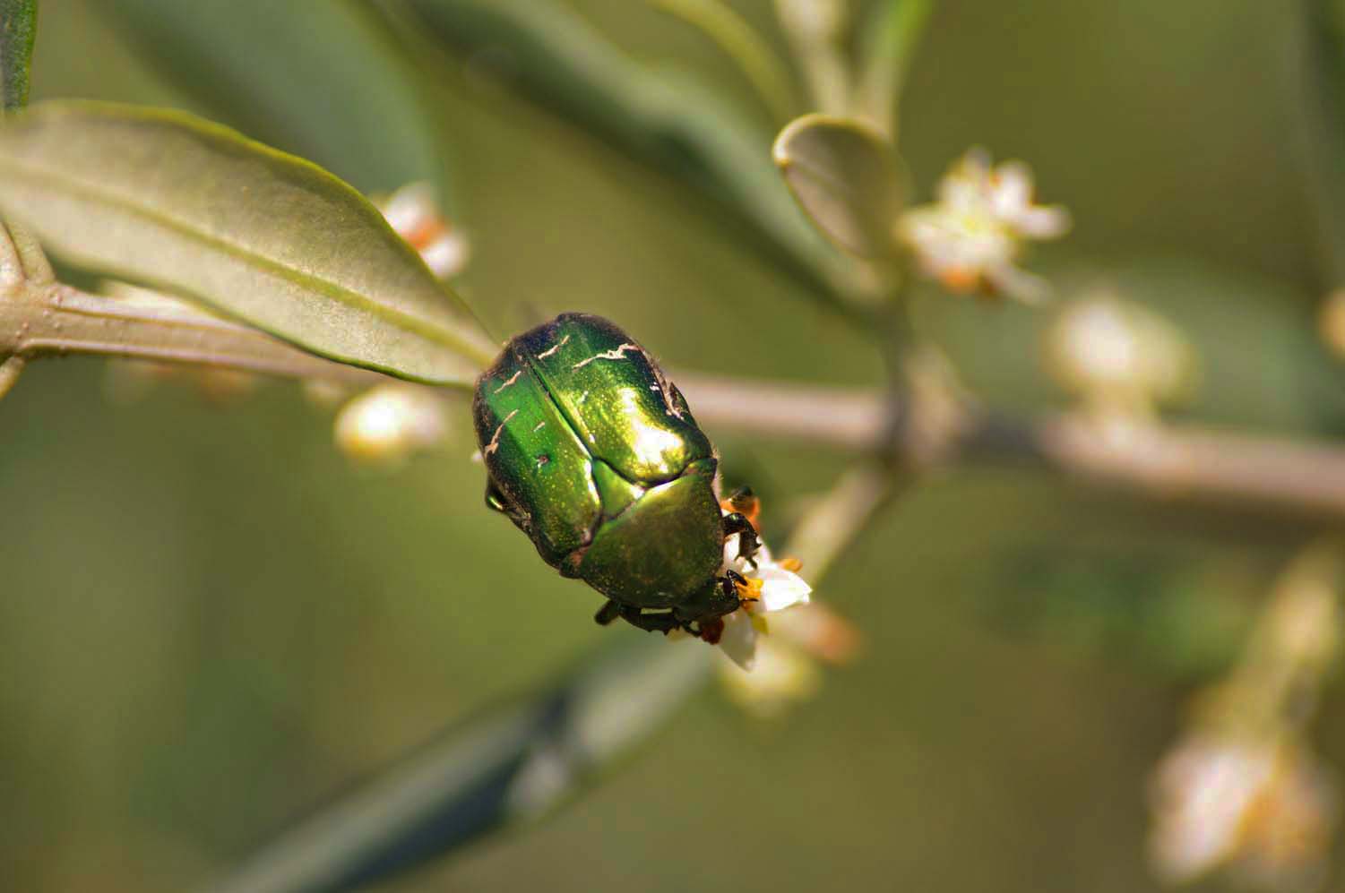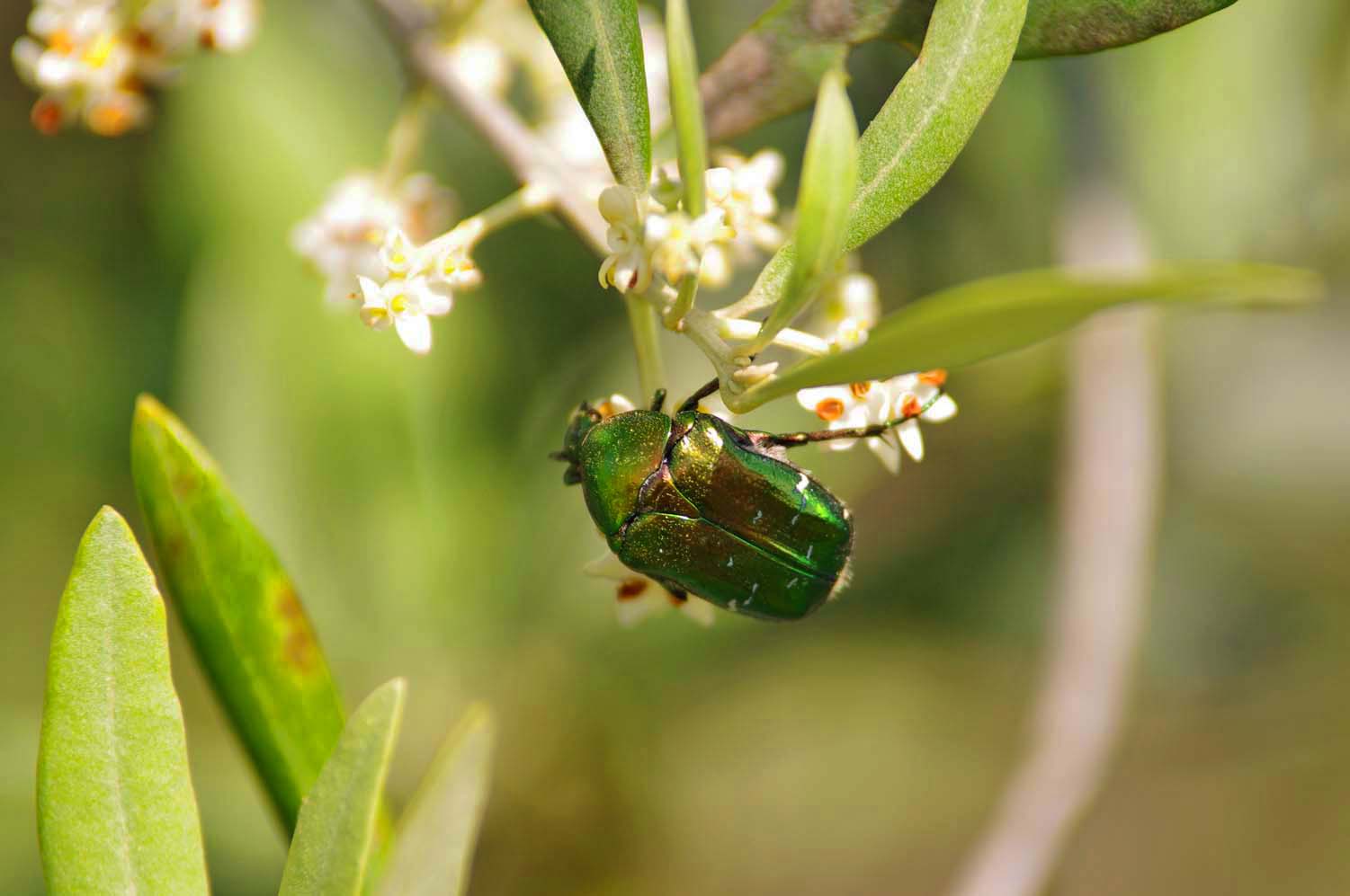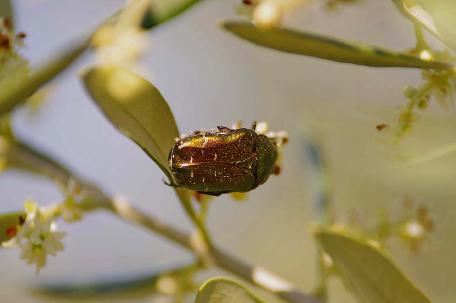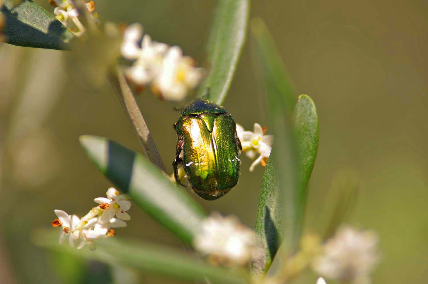 | There were two olive trees blooming in the yard and there were hordes of large green shiny beetles eating the flowers. | Beetles | Suppertime and Hoegaarden White Bier |