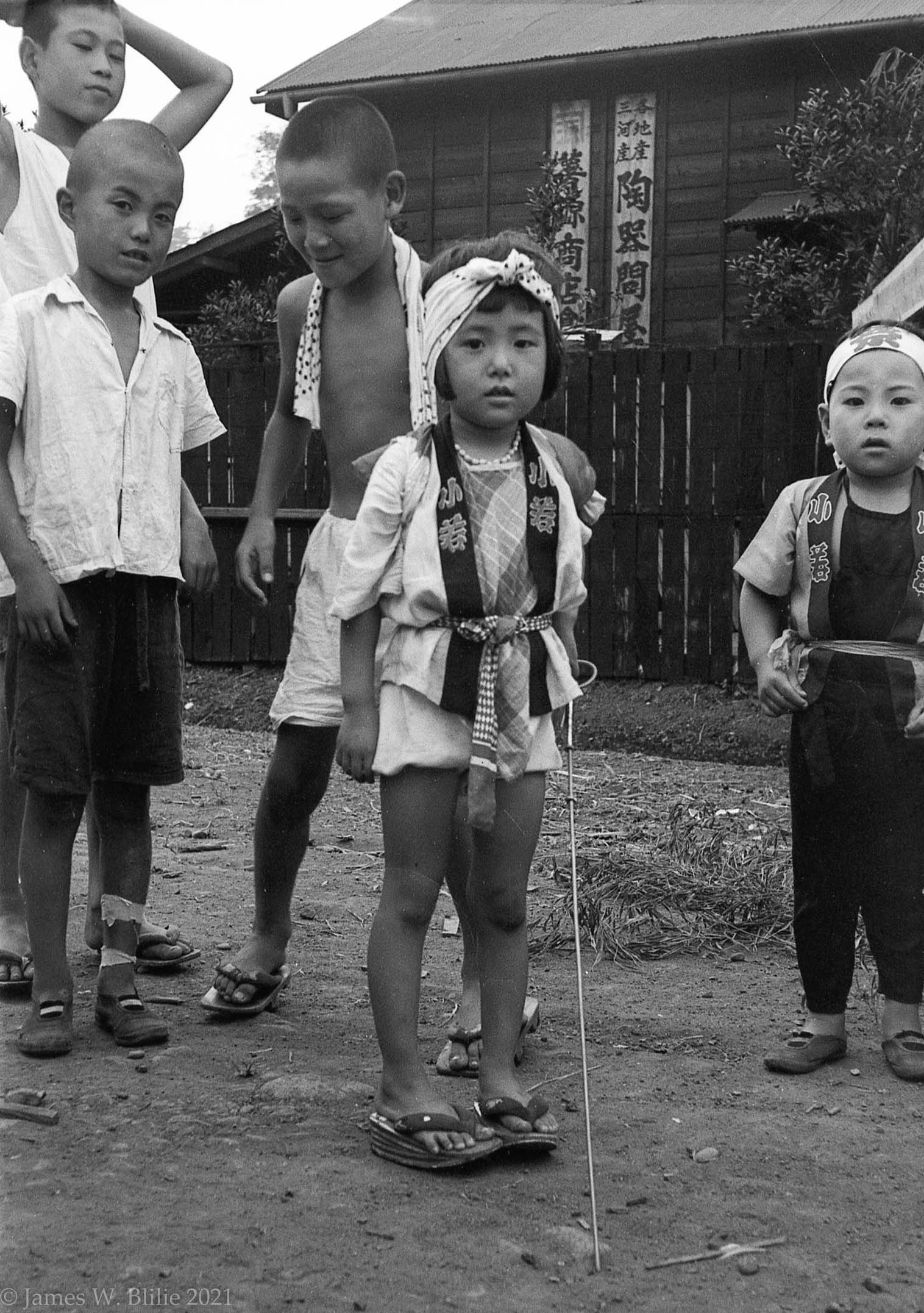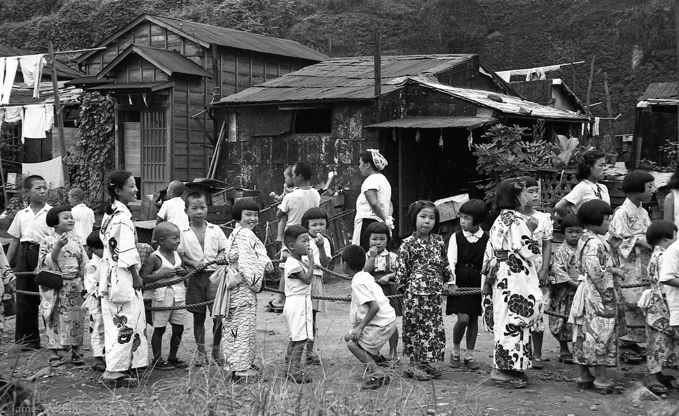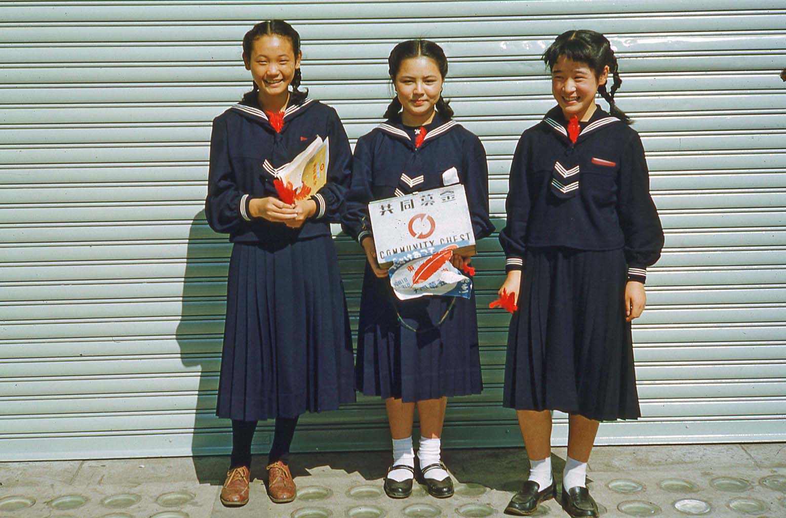 Background image is: School children, Japan 1952 or 1953