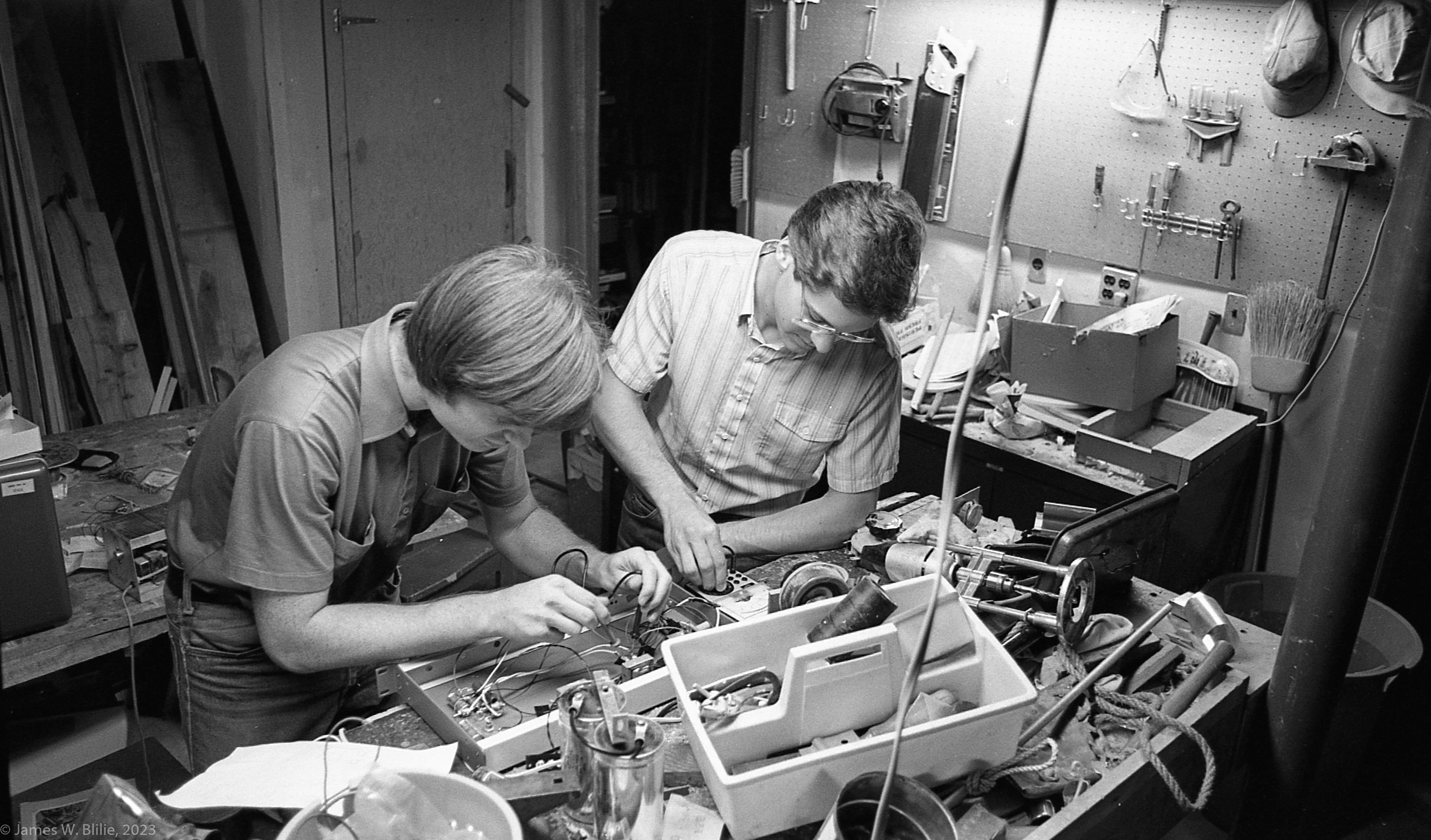 Sep 1983, Charlie and (drummer) Robert Burgenthal repairing and amplifier |