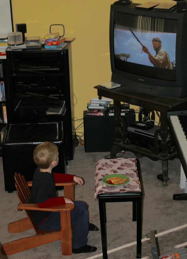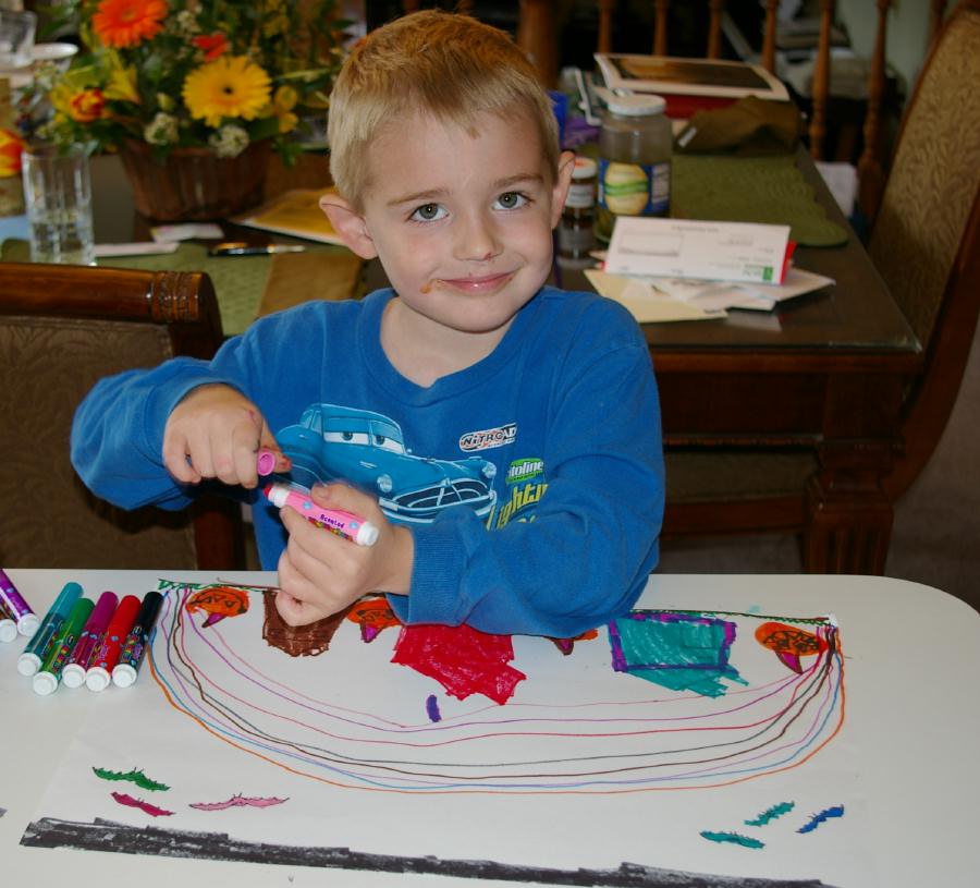 Jamie making a Halloween drawing, watching "Born Free", and with a frog as a hat |