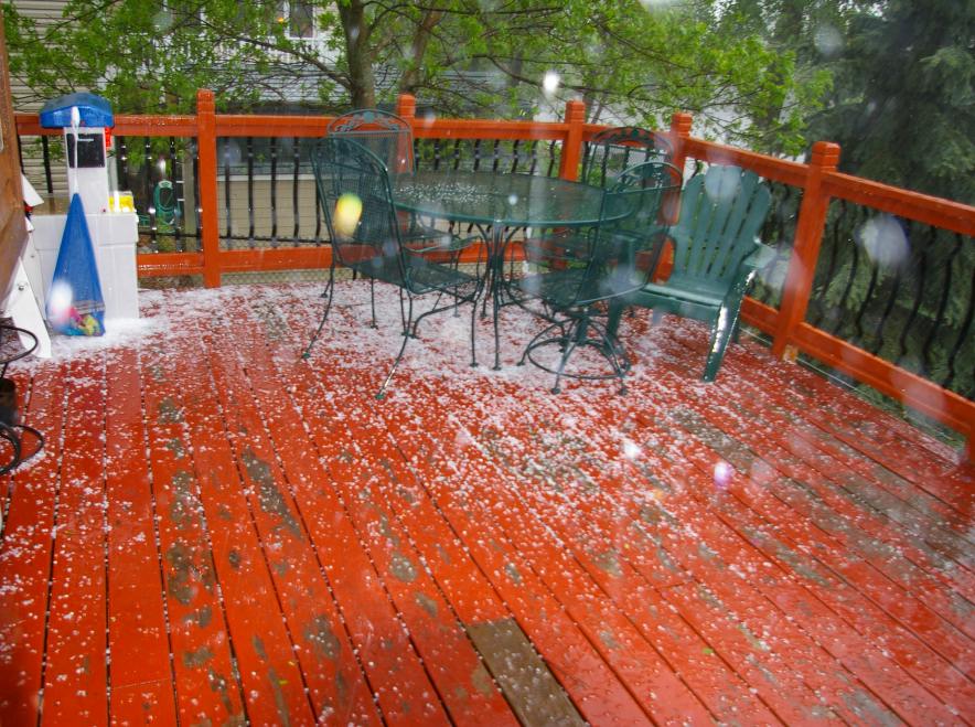 Hail in late May, old finish still on the deck surface |