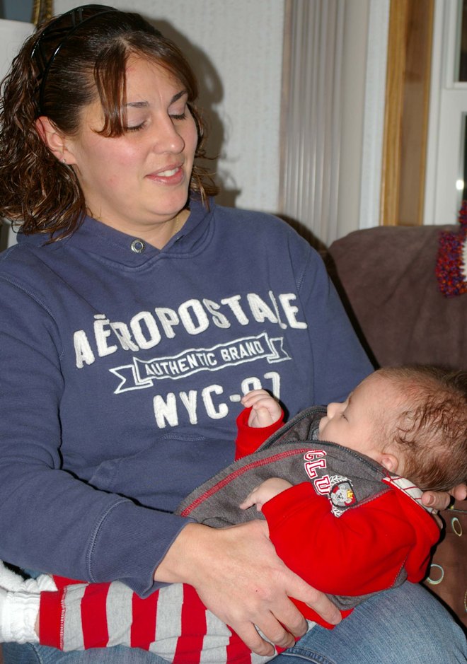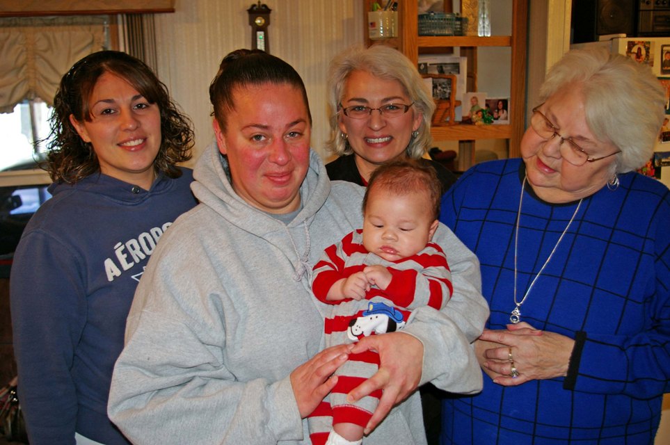 At Grandma Kay's with new babies: Gavin (Rachel's), Wyatt (Cherra's), and Adam (Claire's) |