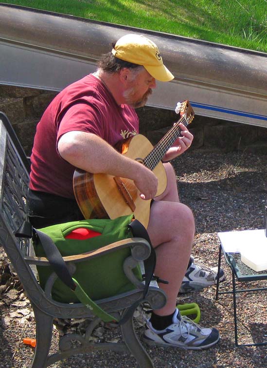 At bottom, he's also holding its twin* which I play (on the left). (*The backs were even cut from the same billet of Brazilian rosewood.) |