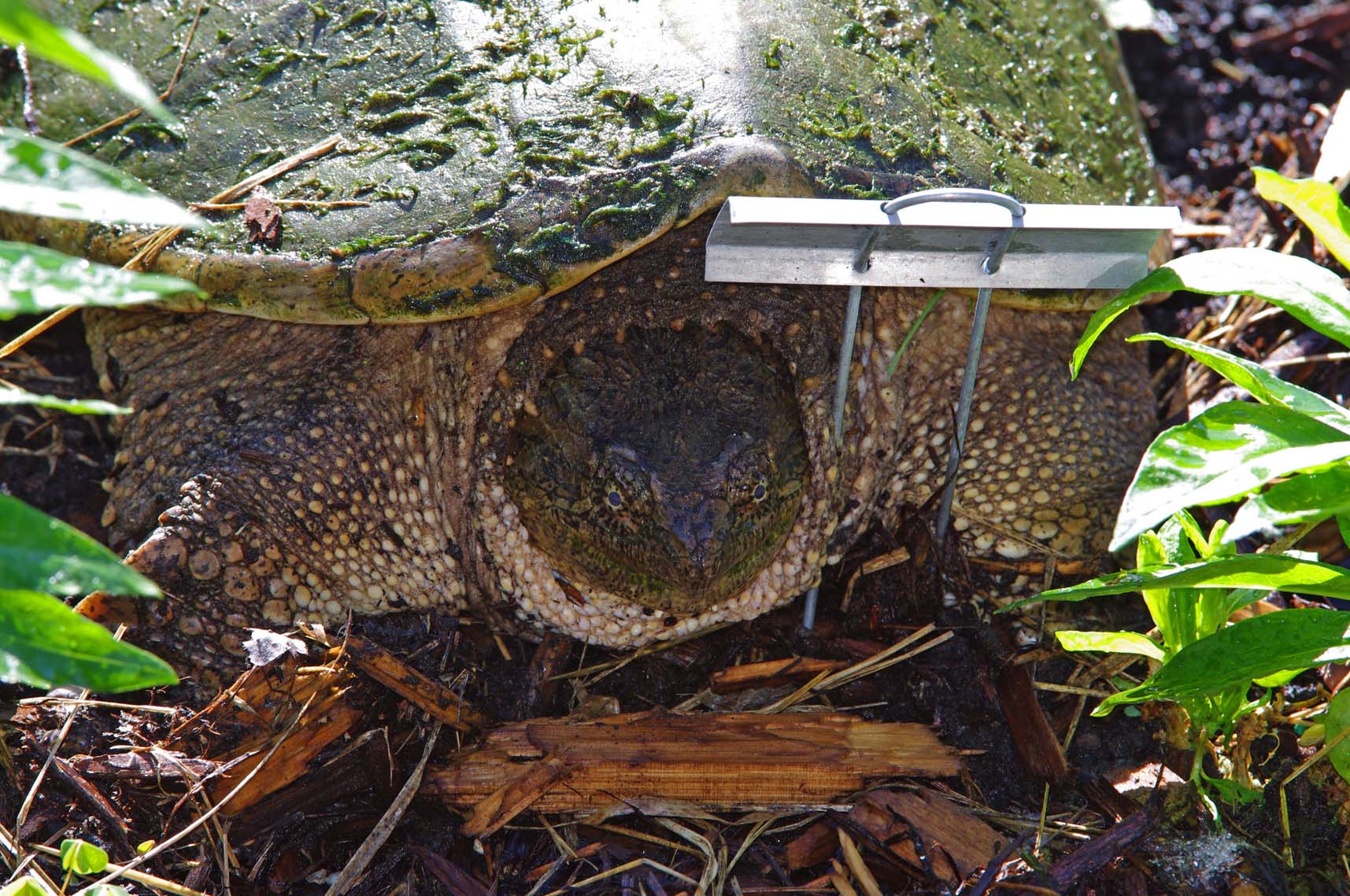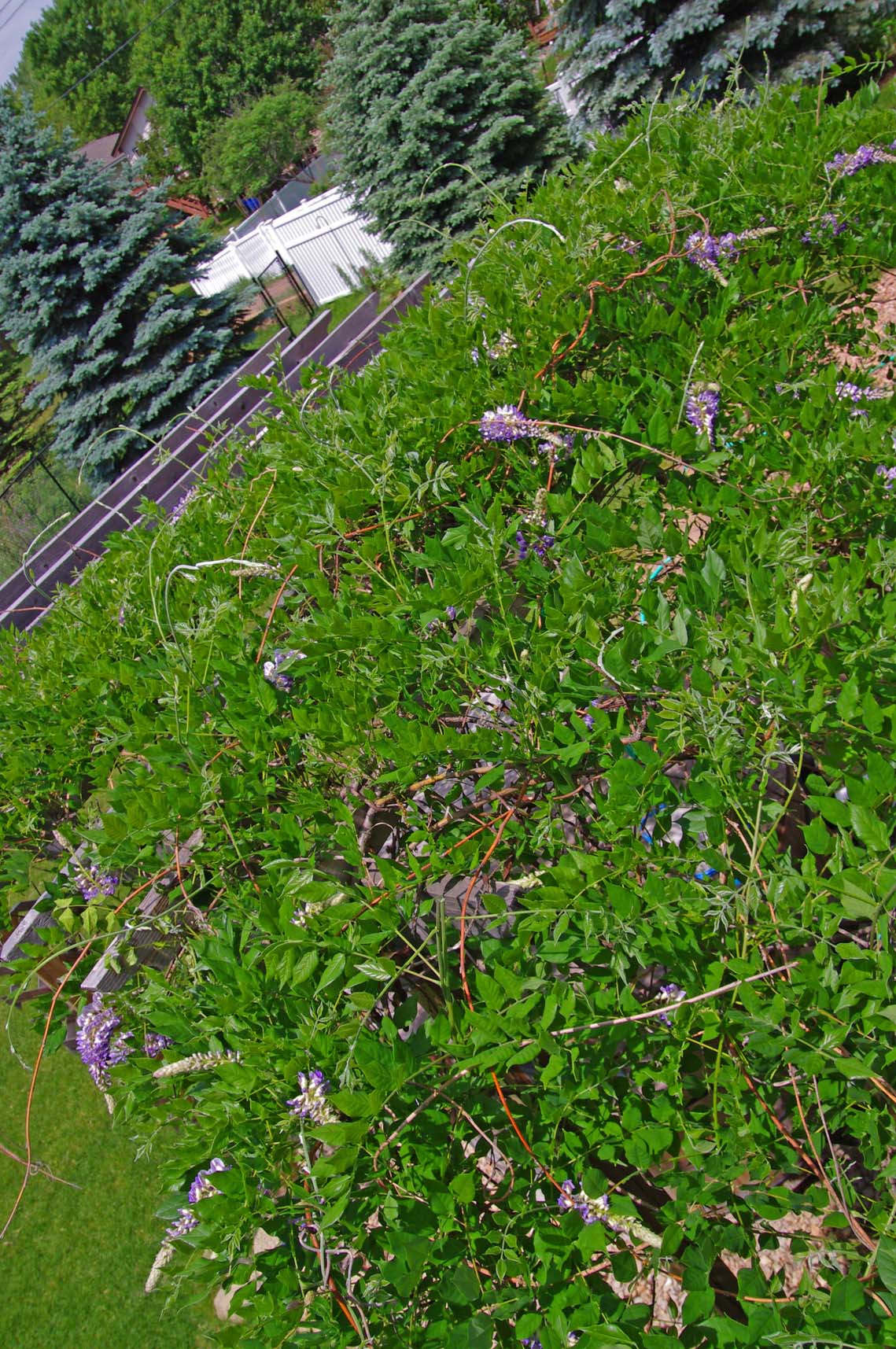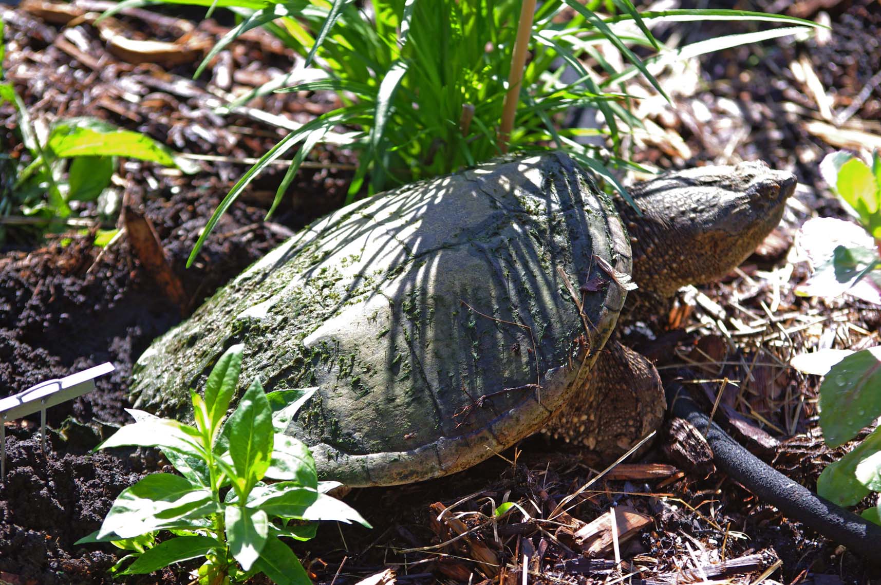 | Here was a big surprise one morning: A big snapping turtle laying her eggs in our front garden! | Big snapper laying her eggs. | Jamie, driving my little radio-controlled boat on our pond | Our wisteria in bloom | Our wisteria in bloom (fisheye lens) |