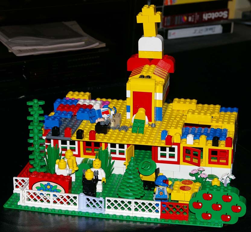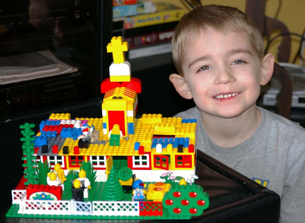 Jamie and his church he made of LEGOs. Notice the people drinking wine and eating pizza. |