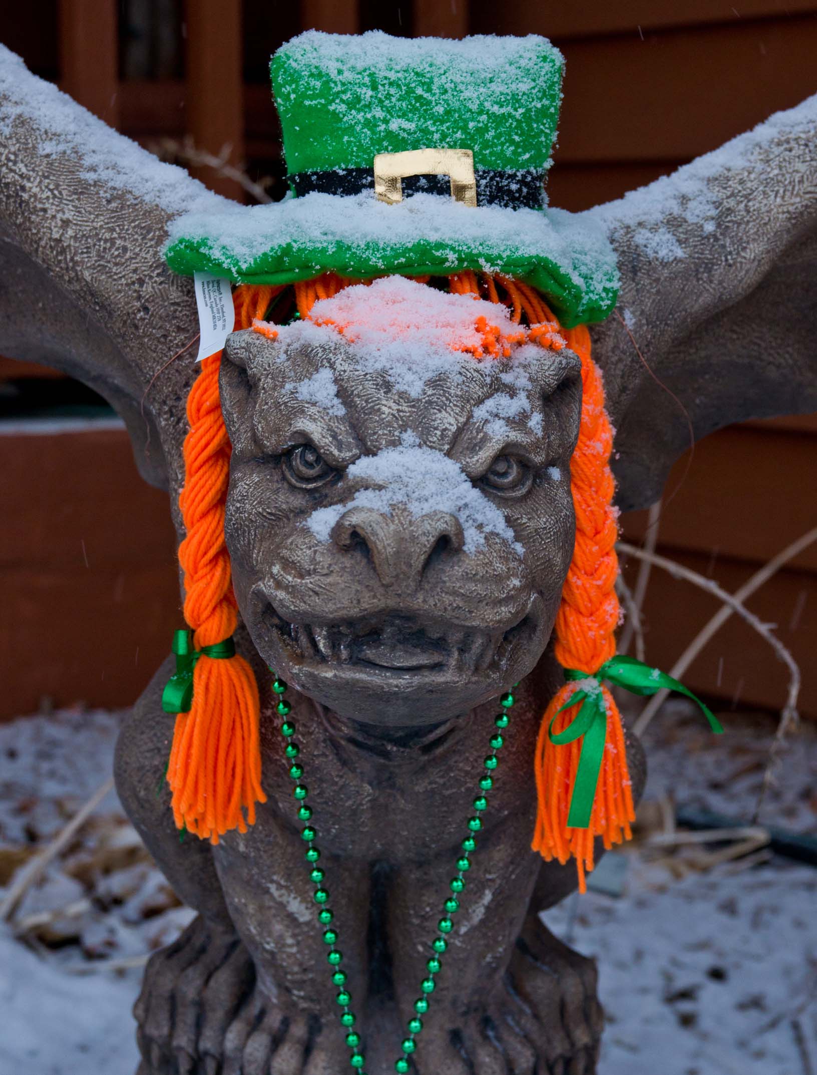Our gargoyle, ready for St. Paddy's Day |