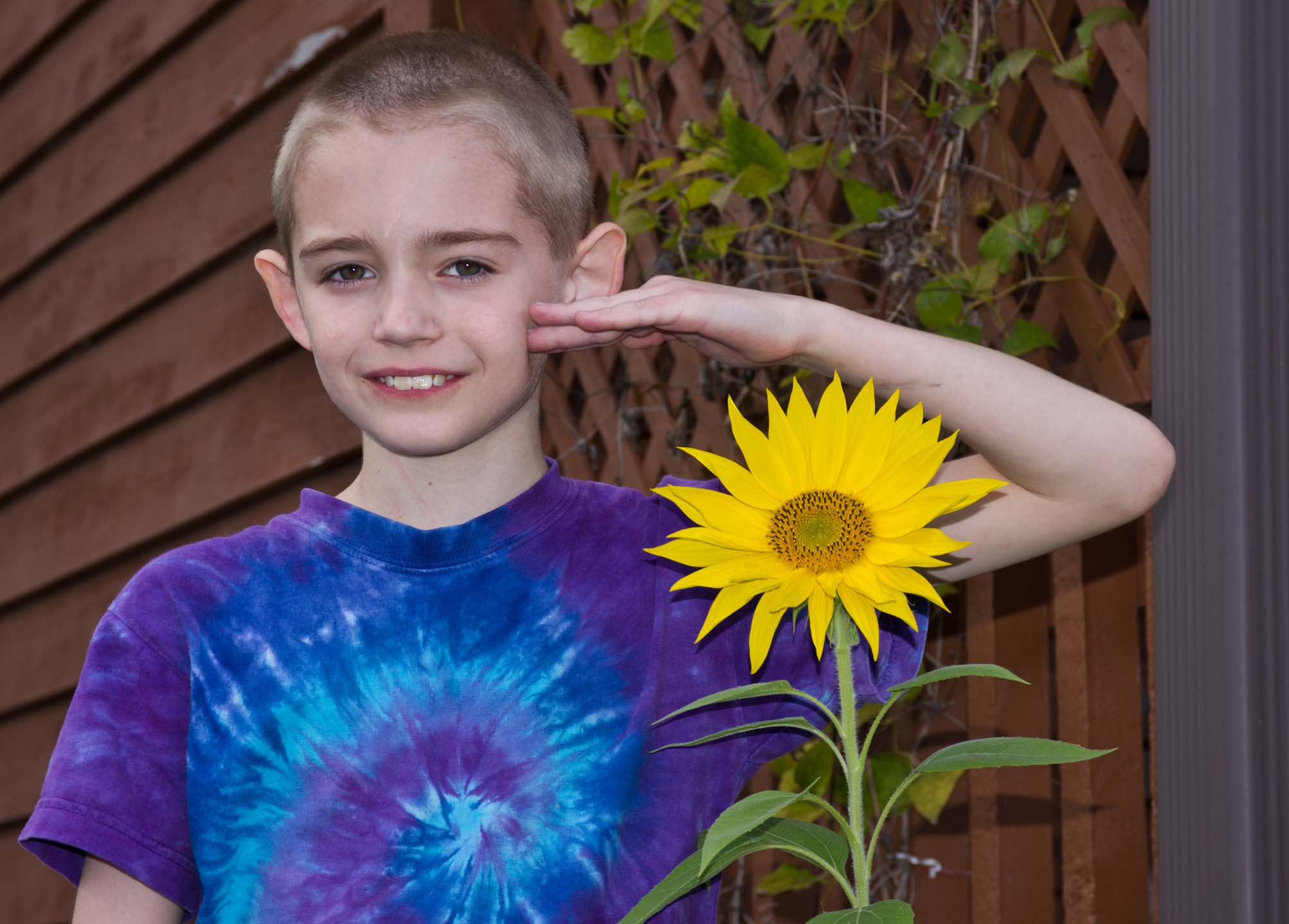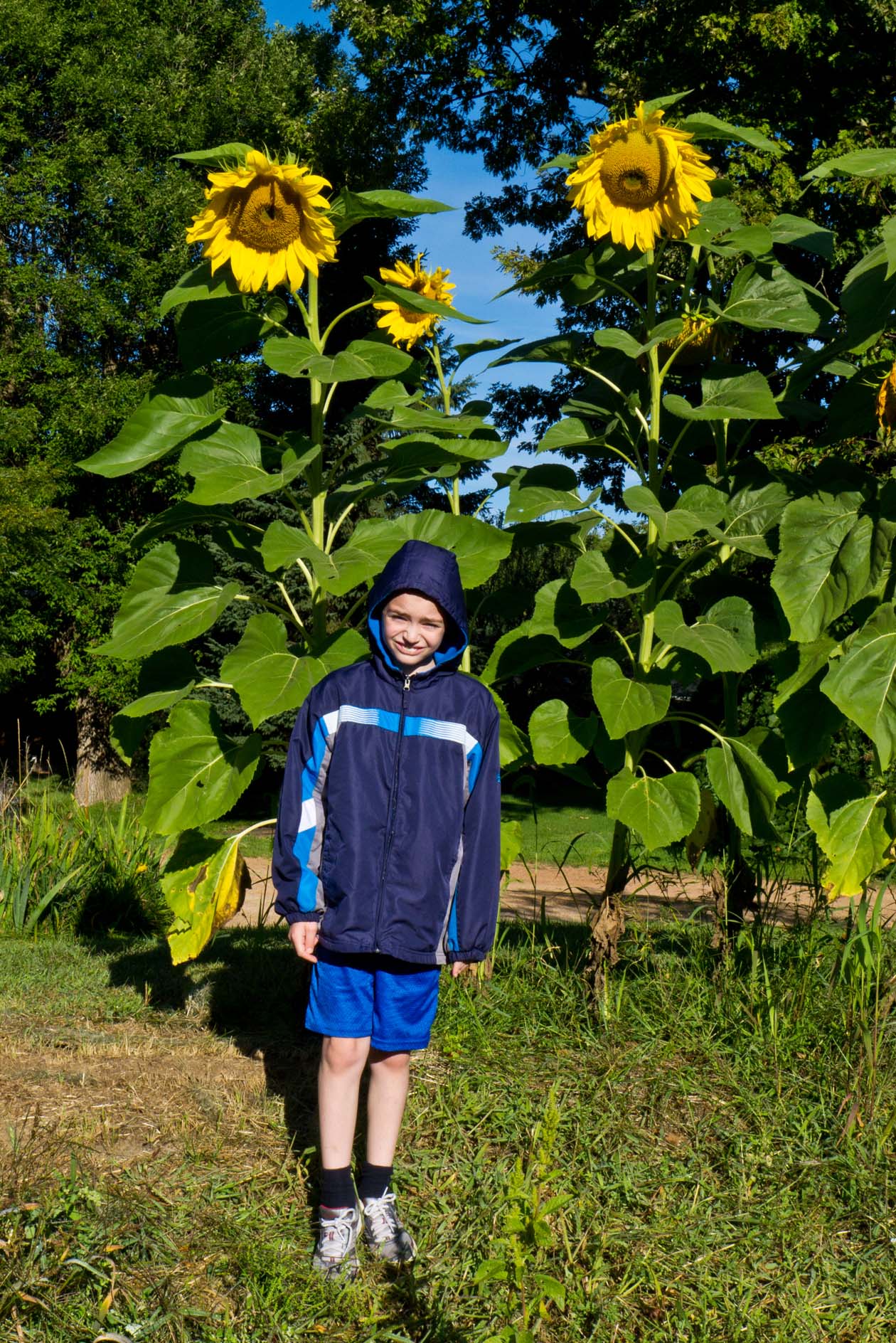 Jamie and his sunflower (blooming on 22-Sep-12!) |