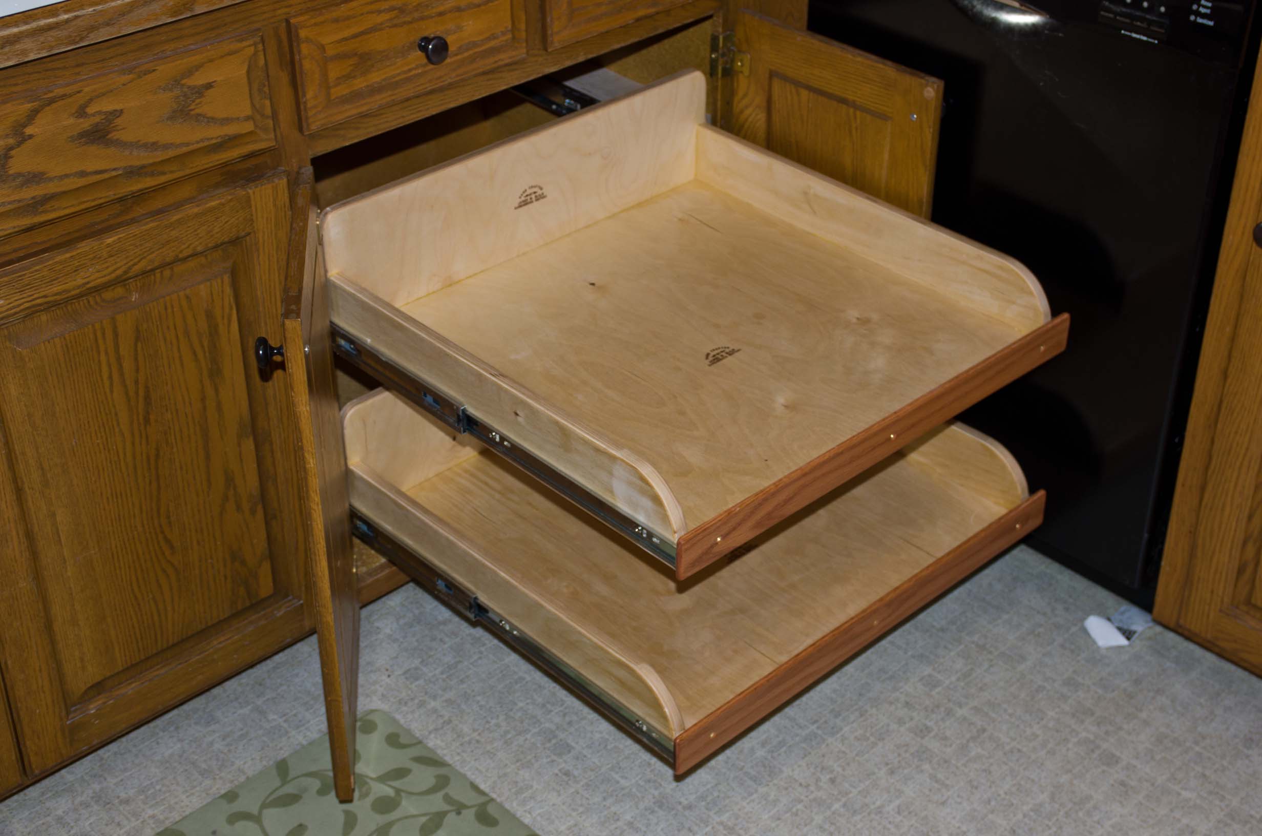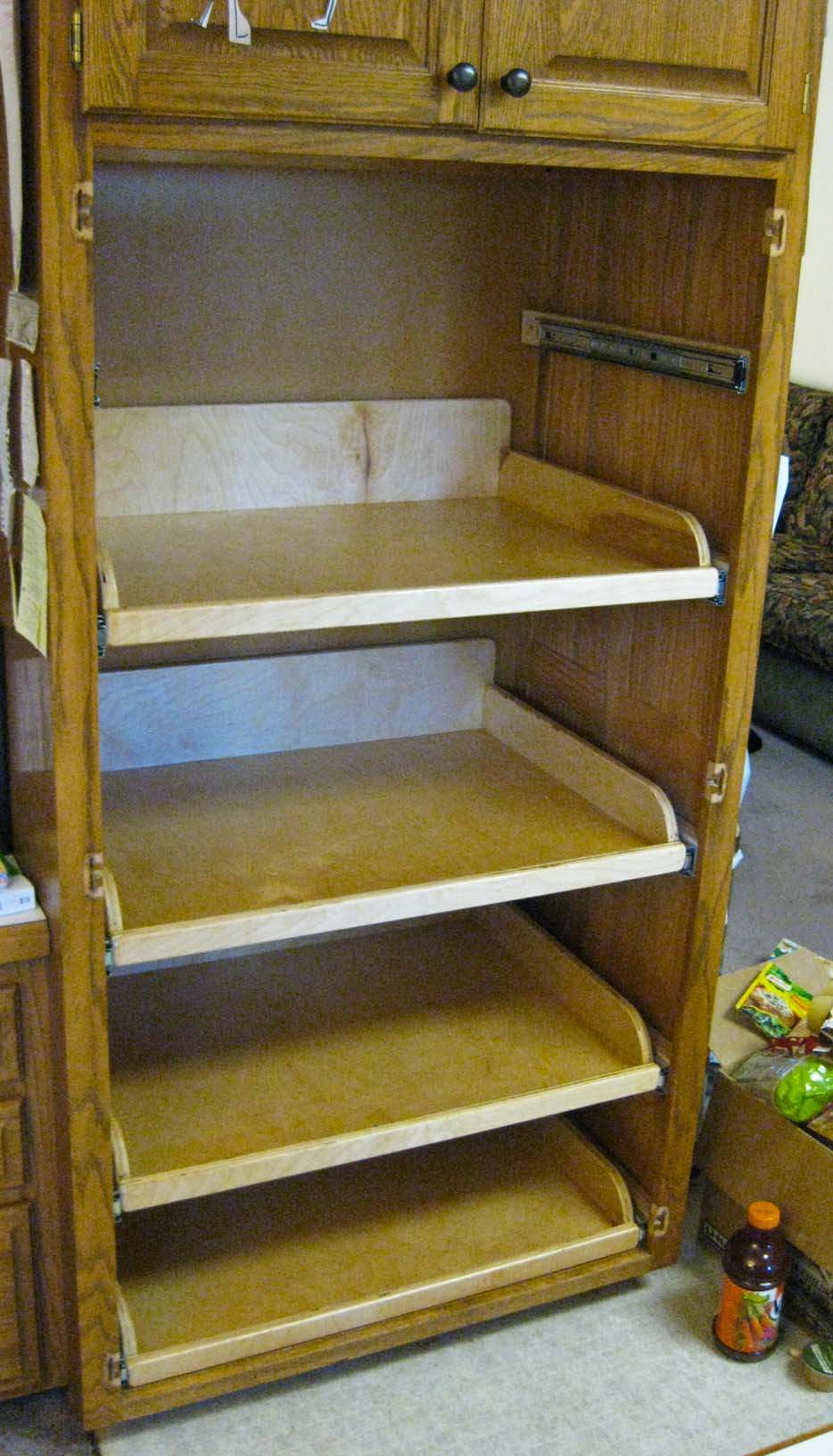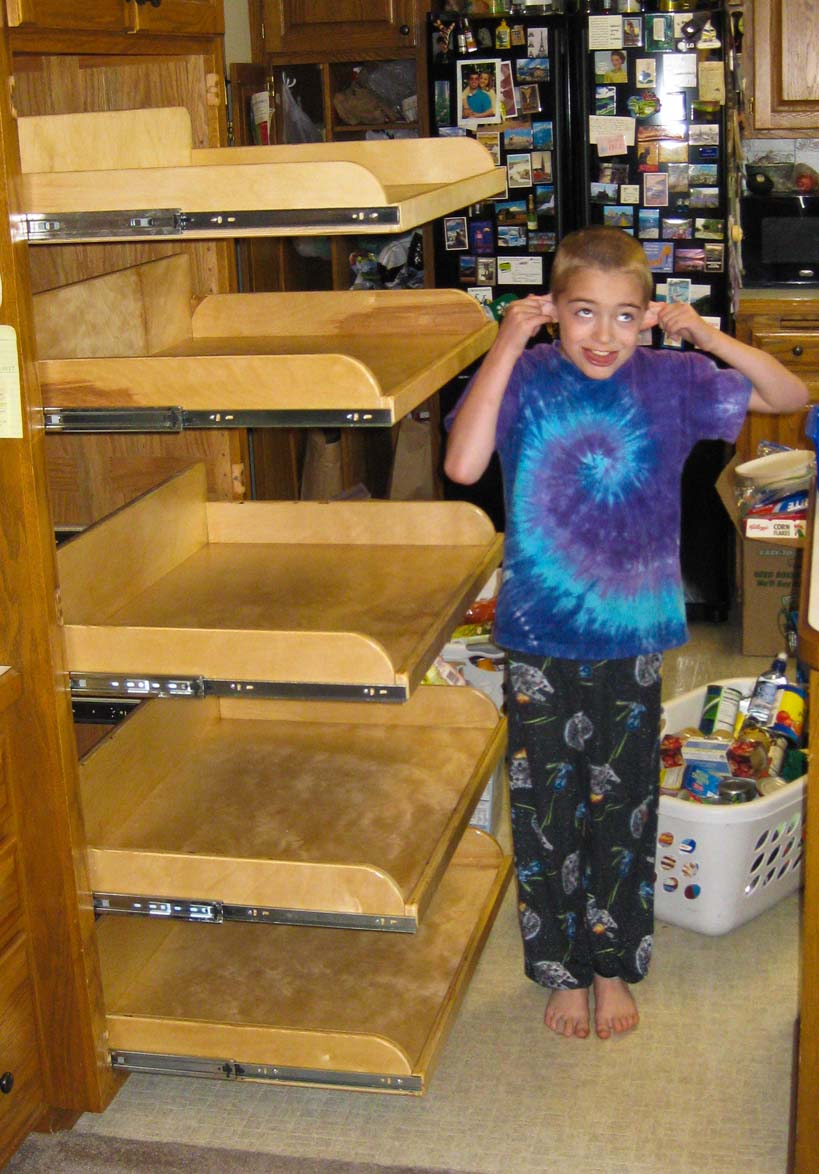 We had a big project this fall: Put full-extension shelves into our cabinets in the kitchen. I had to build them and then finish and install them. |