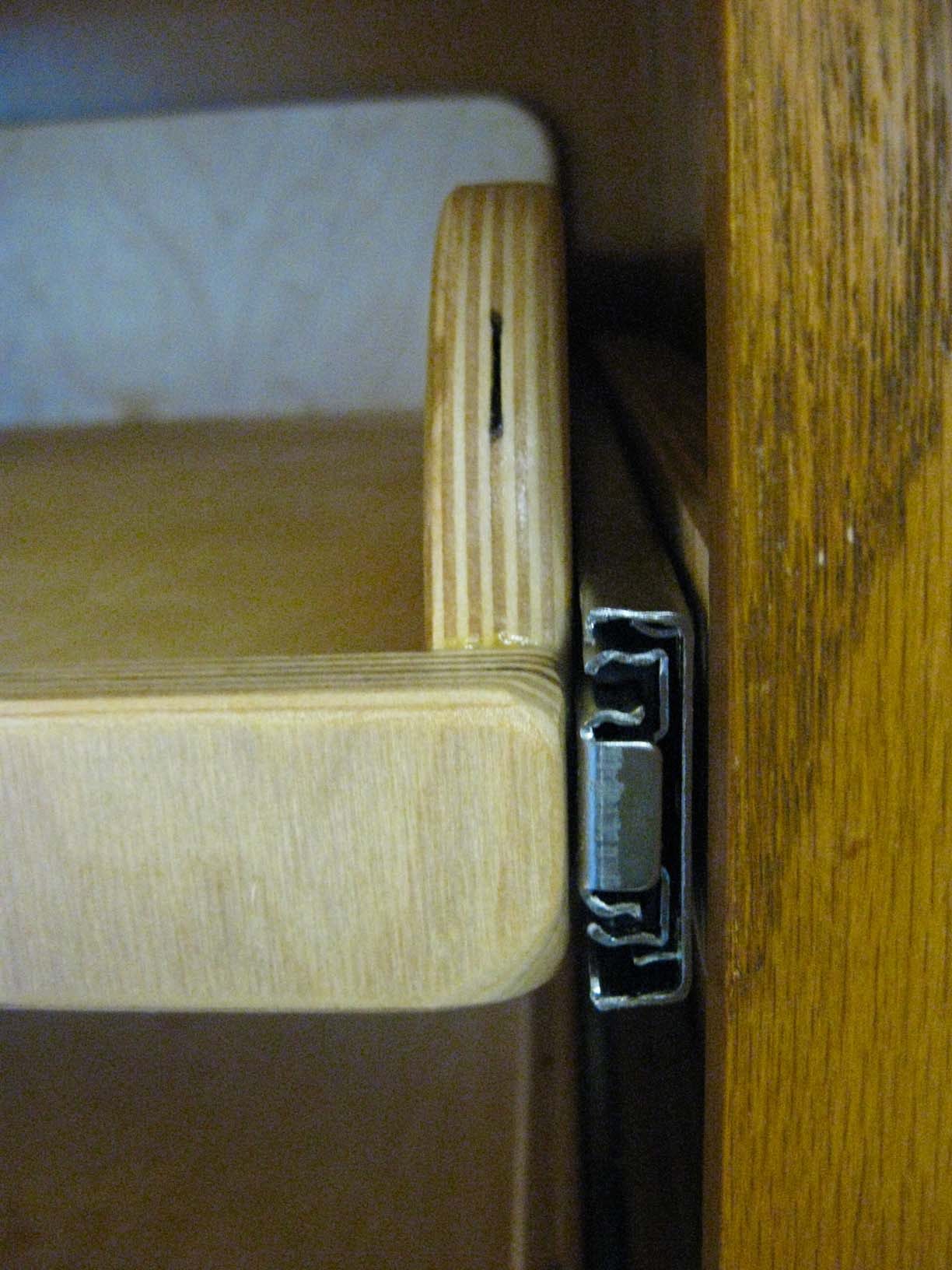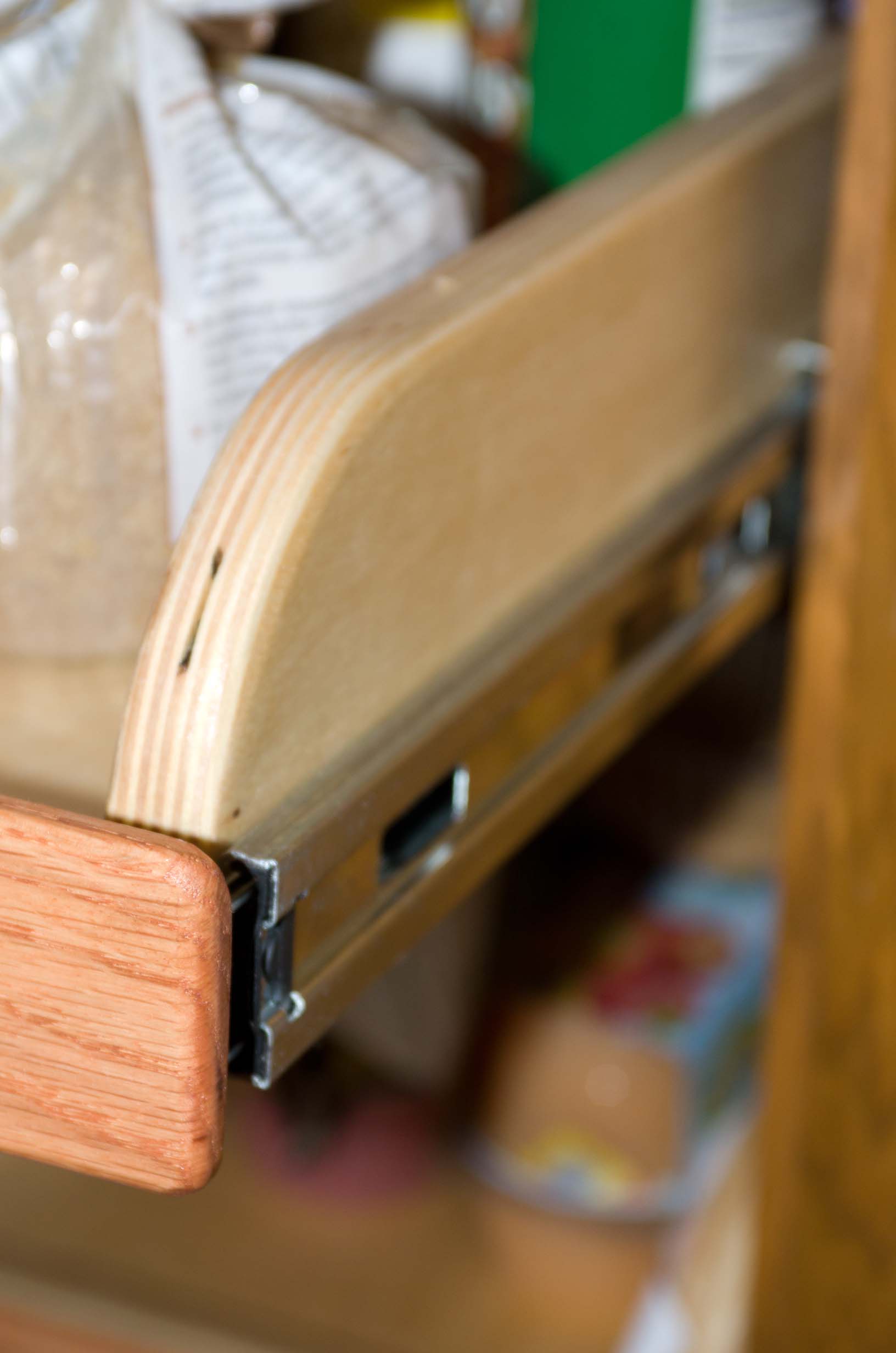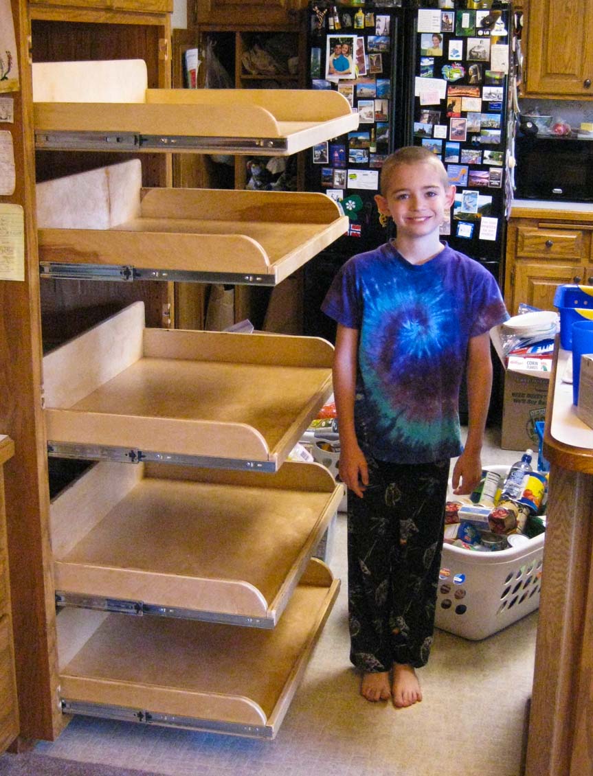We had a big project this fall: Put full-extension shelves into our cabinets in the kitchen. I had to build them and then finish and install them. |