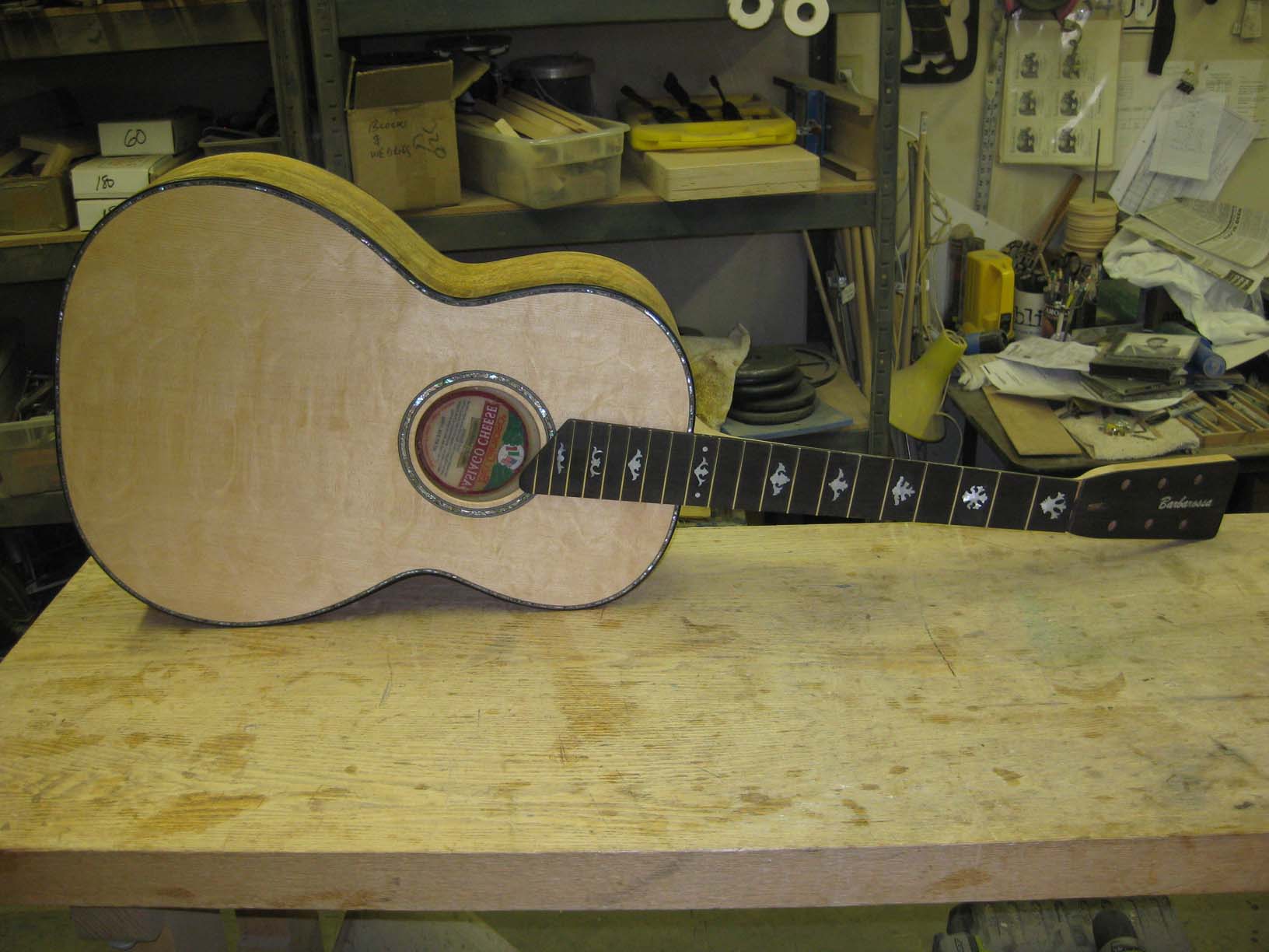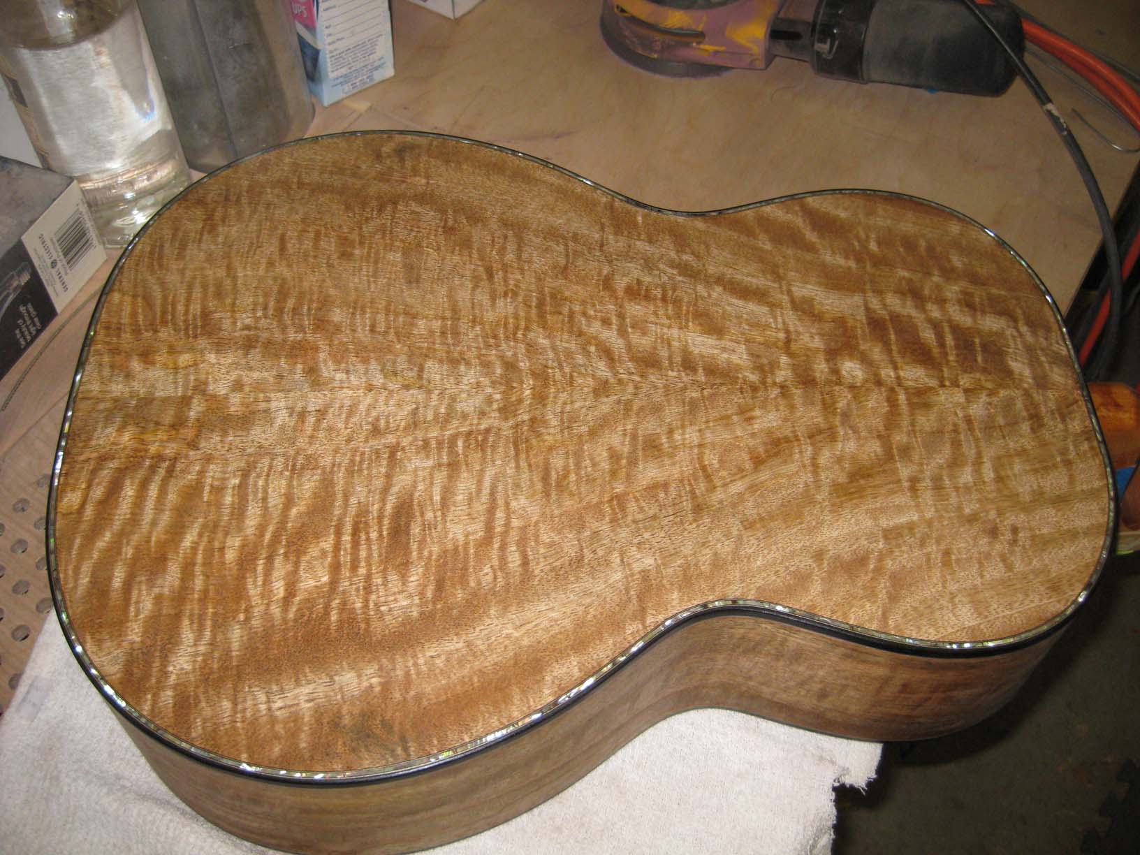 Phyllis talked me into making myself a "blingy" guitar. Curly mango back and sides, shell edging, fancy inlays. |
