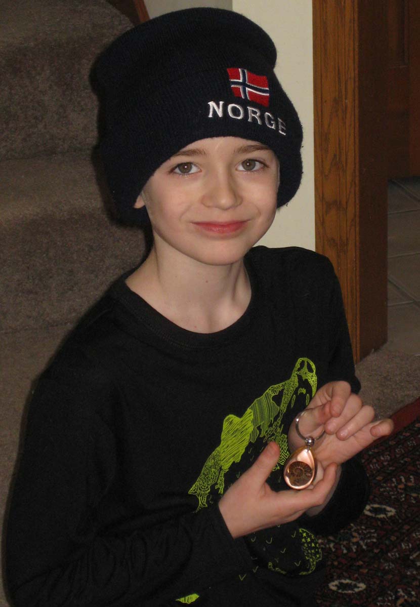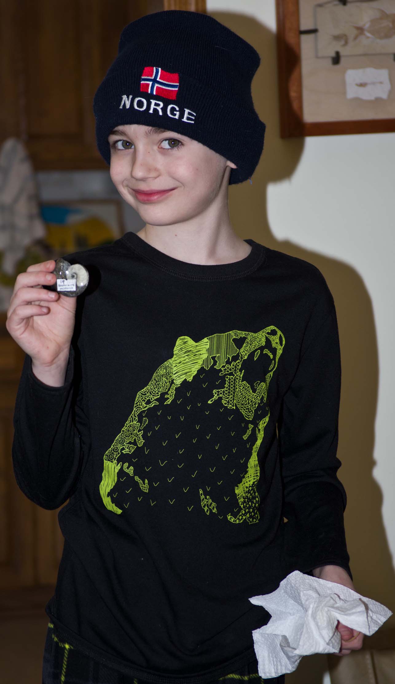 Jamie with our new curiosity cabinet, full of fossils |
