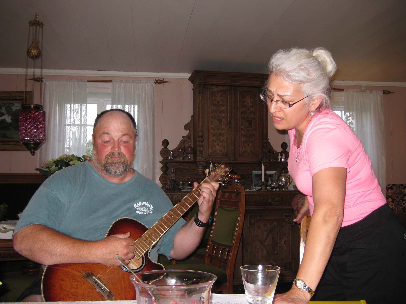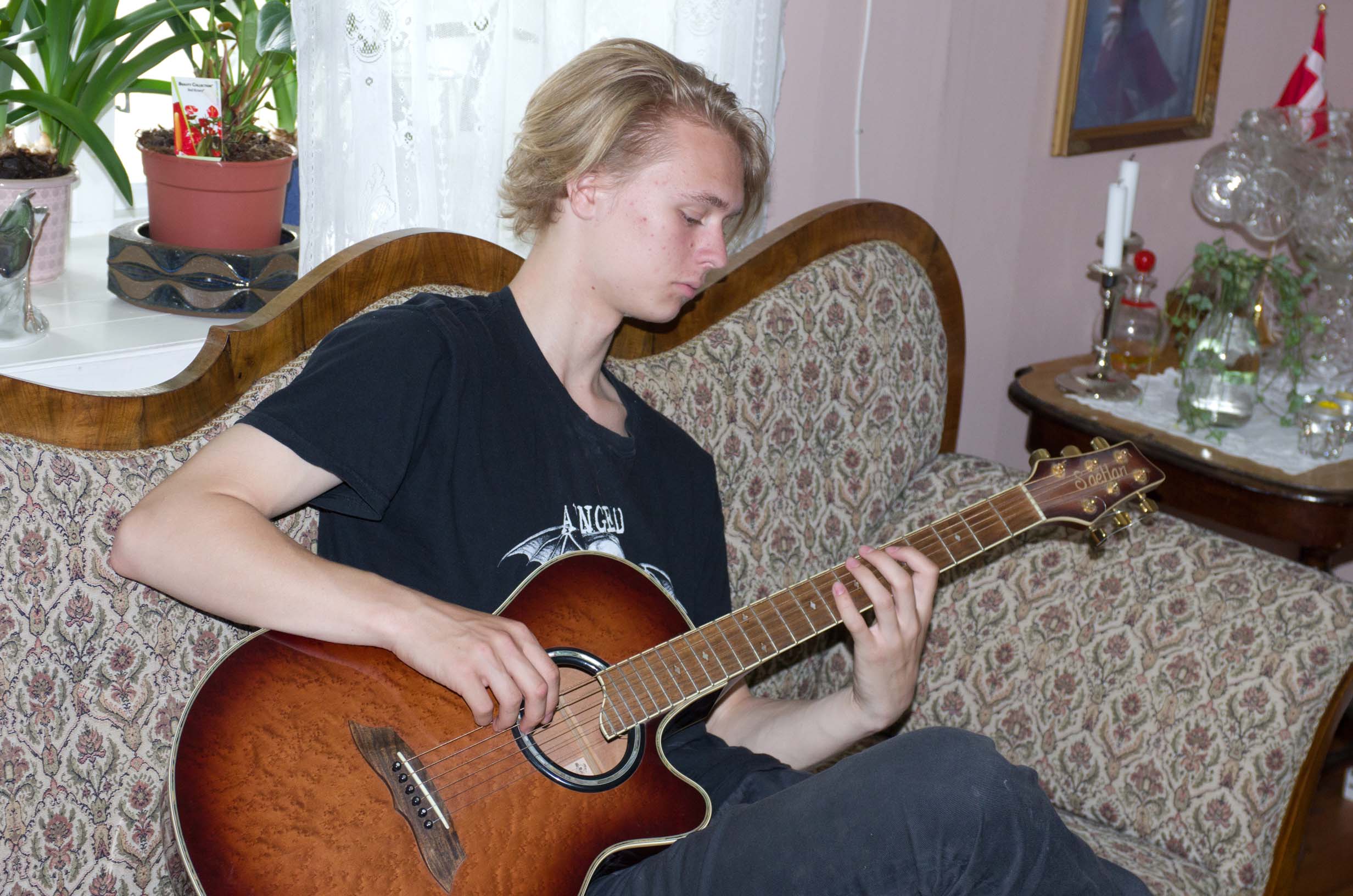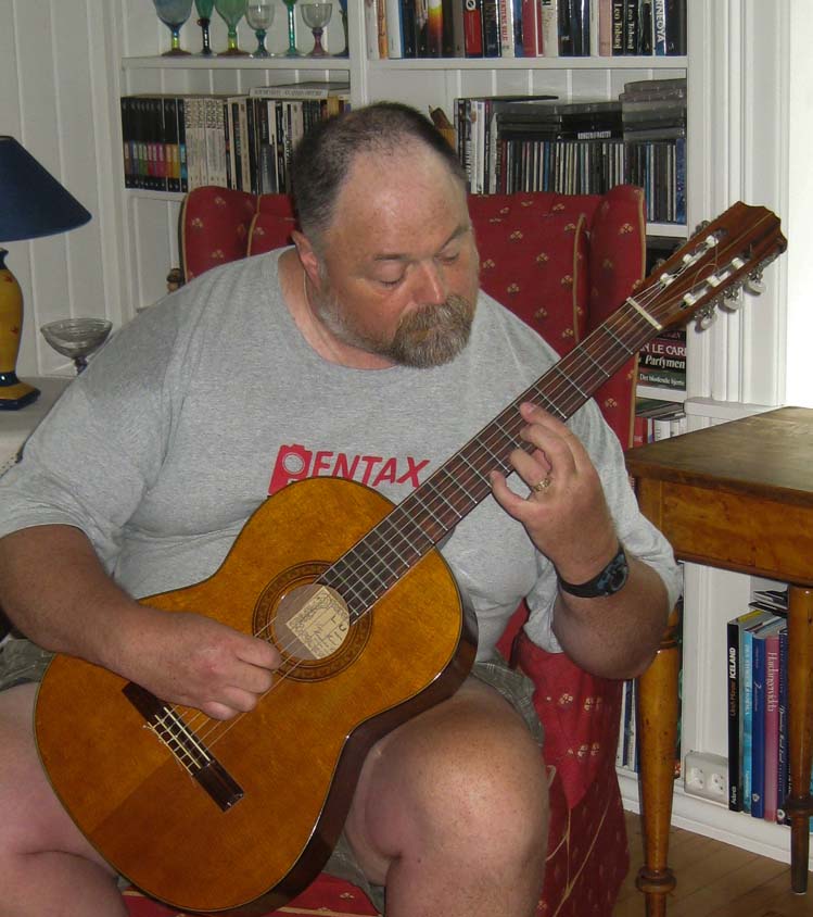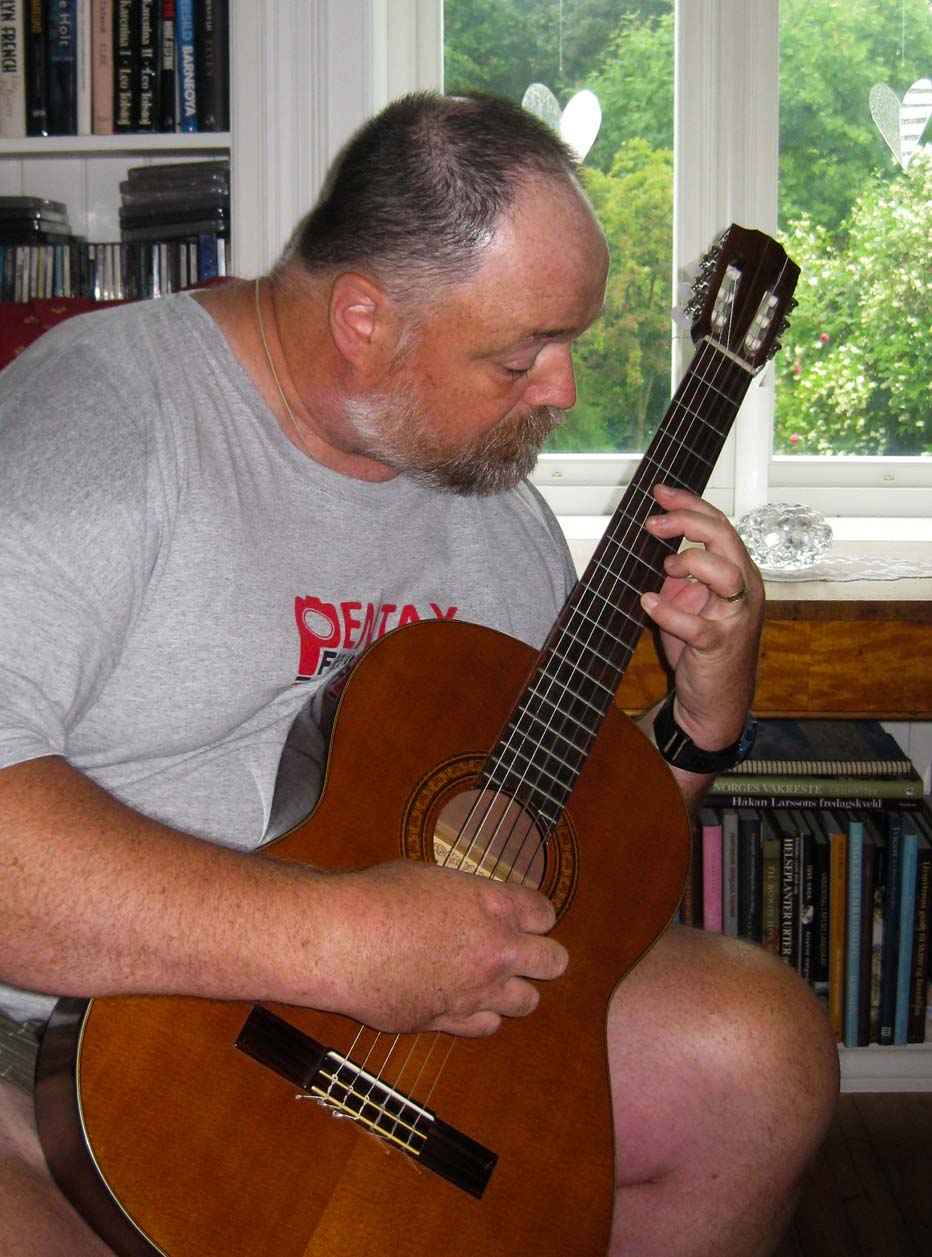Me playing Eskild's guitar | We visited with Ellen Johnanne and Jørn at their home in Gjøvik, above the Mjøsafjord |