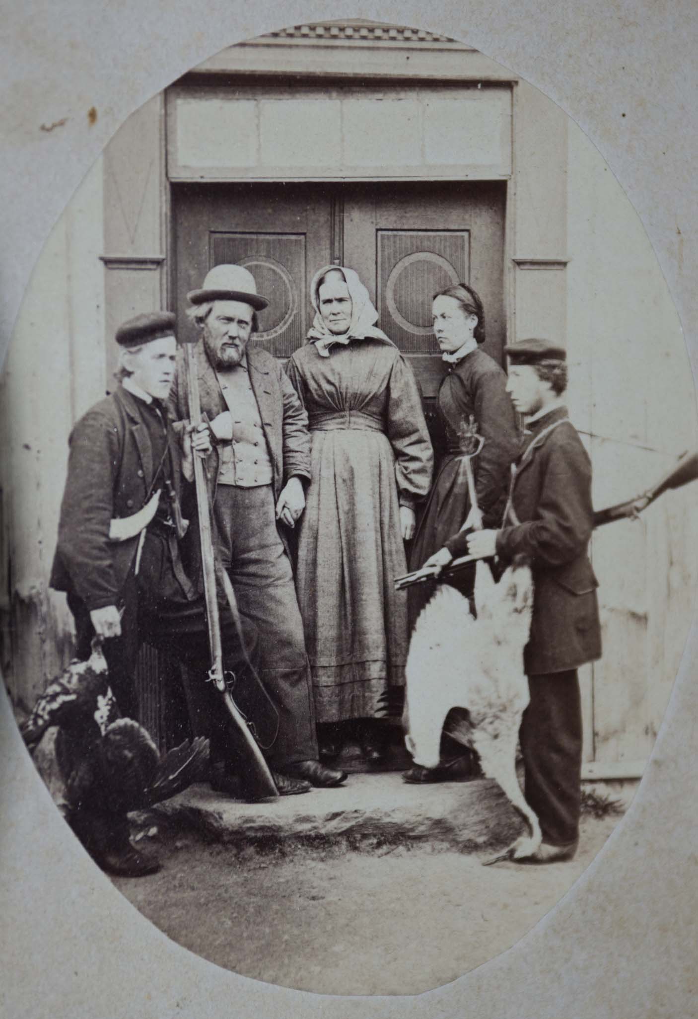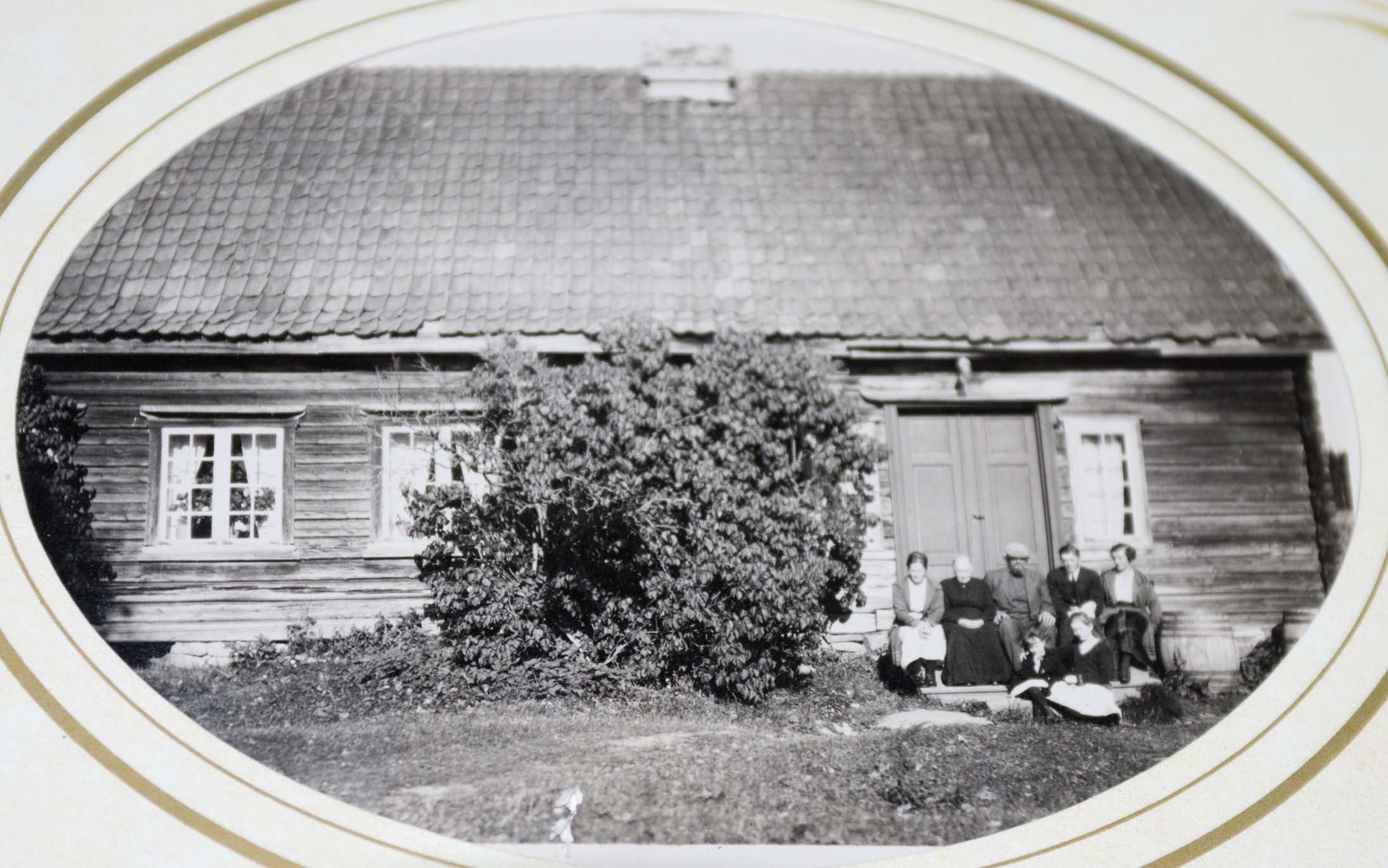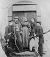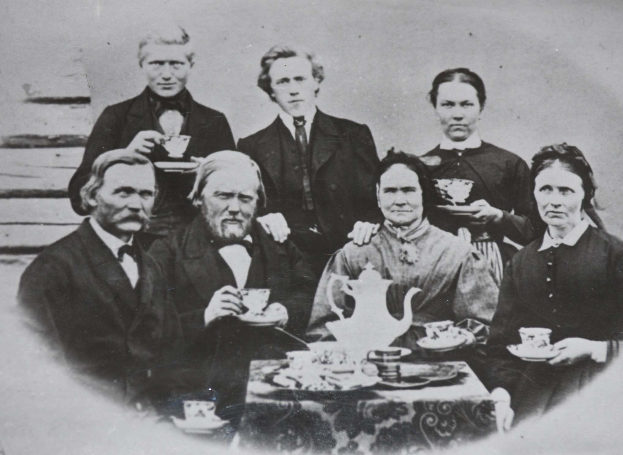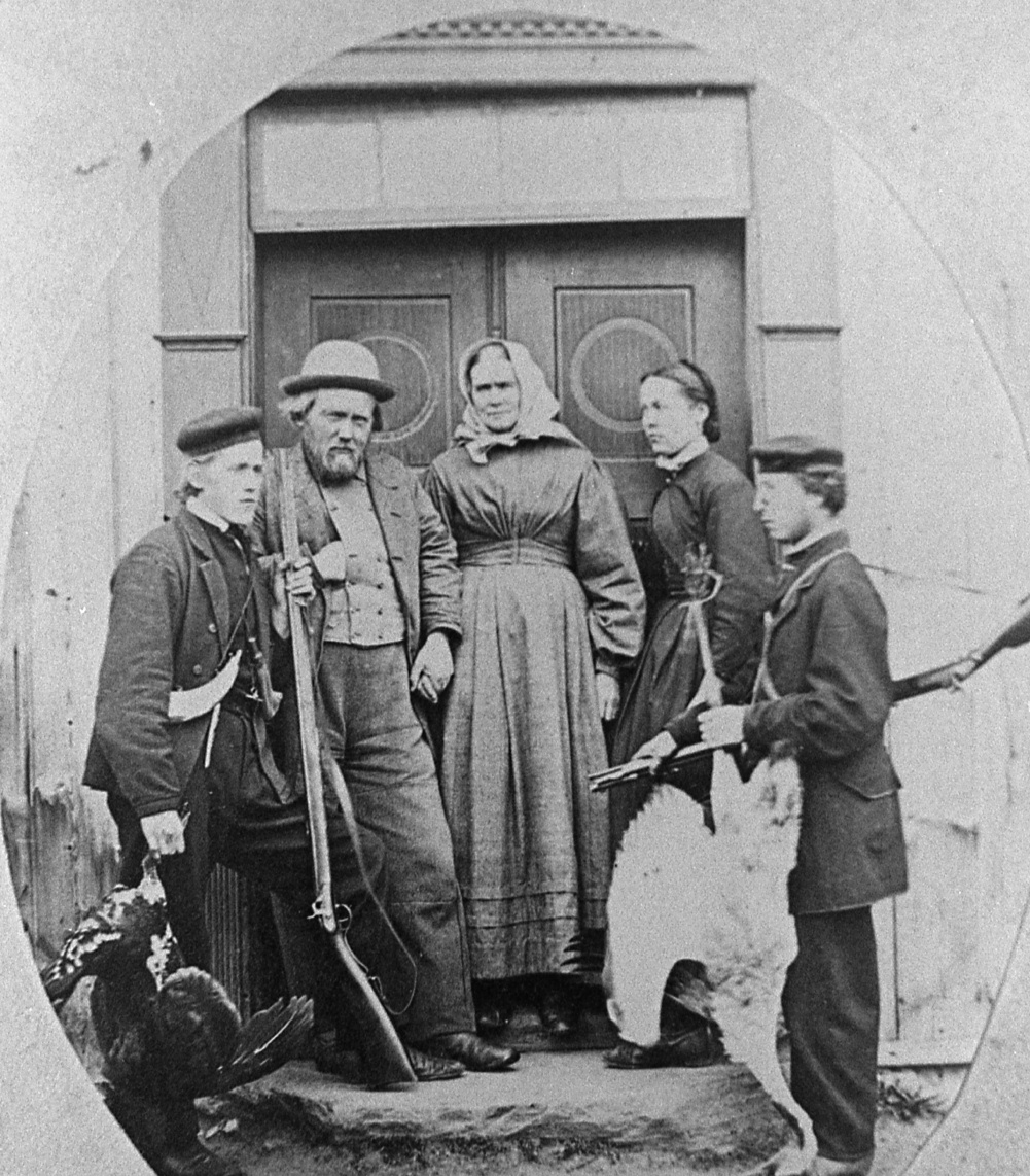 | My great grandfather, Hans Christian Blilie with his wife Regene (Arnsen) Blilie, and sons, Louis (Lars), my grandfather, Marius (Maurice), and John (Johan), circa 1890, in Wisconsin | John Arne Narum (second from left) around 1947 with "the doorway" on Bliligård behind the family group |