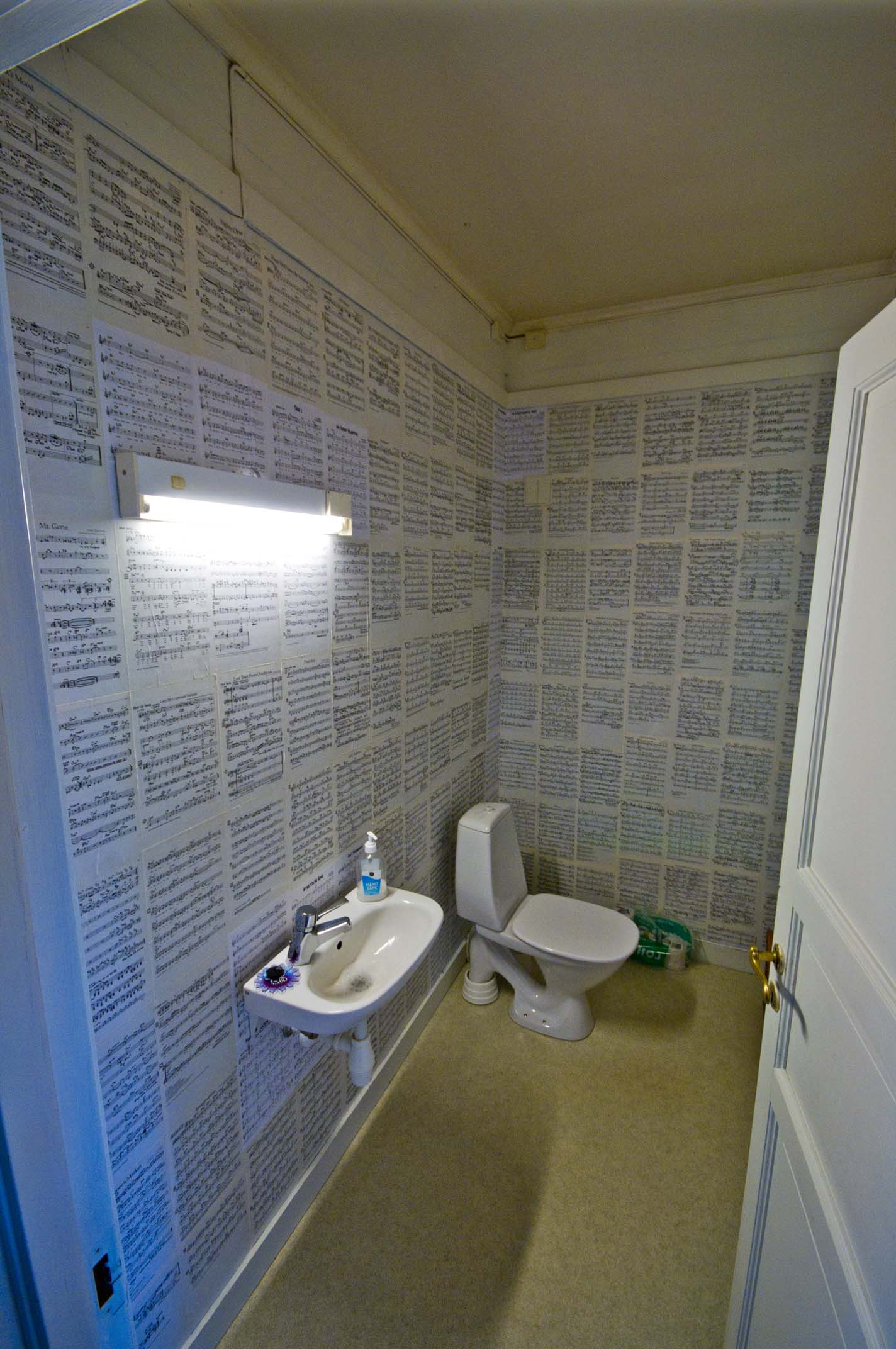 Cool bathroom, papered with sheet music! |