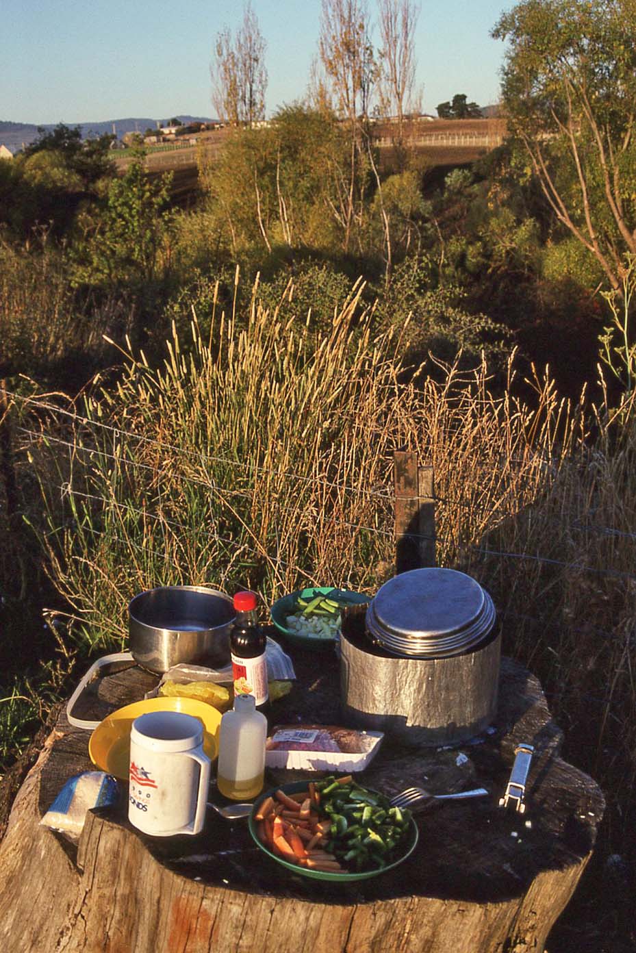 | Camp, Tassie (just keep banging the rocks together!) | Here comes winter! | Sunrise, central Tassie | The Marlborough Highway across Tasmania | |